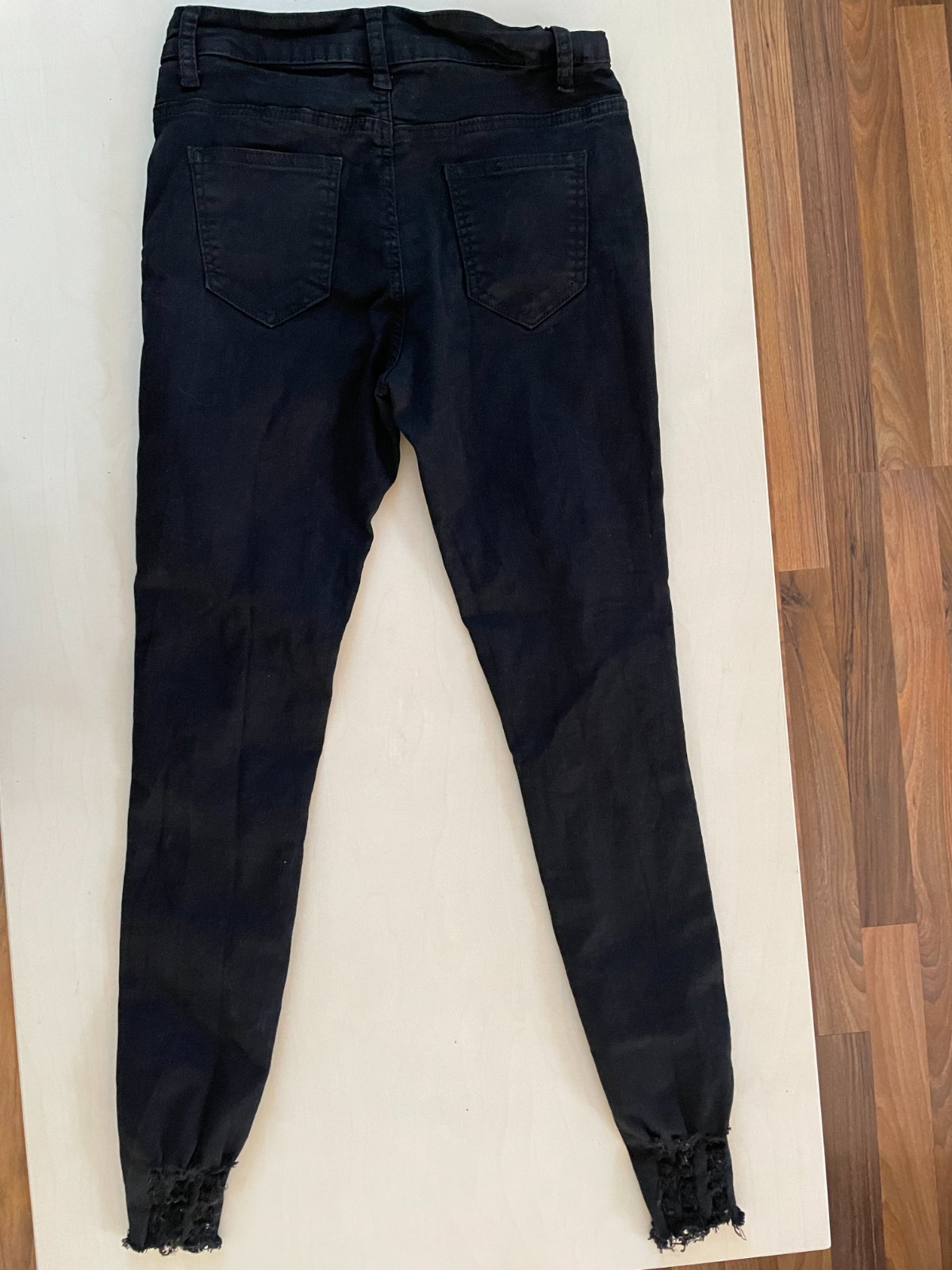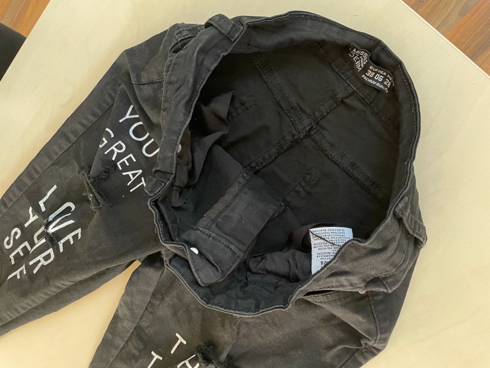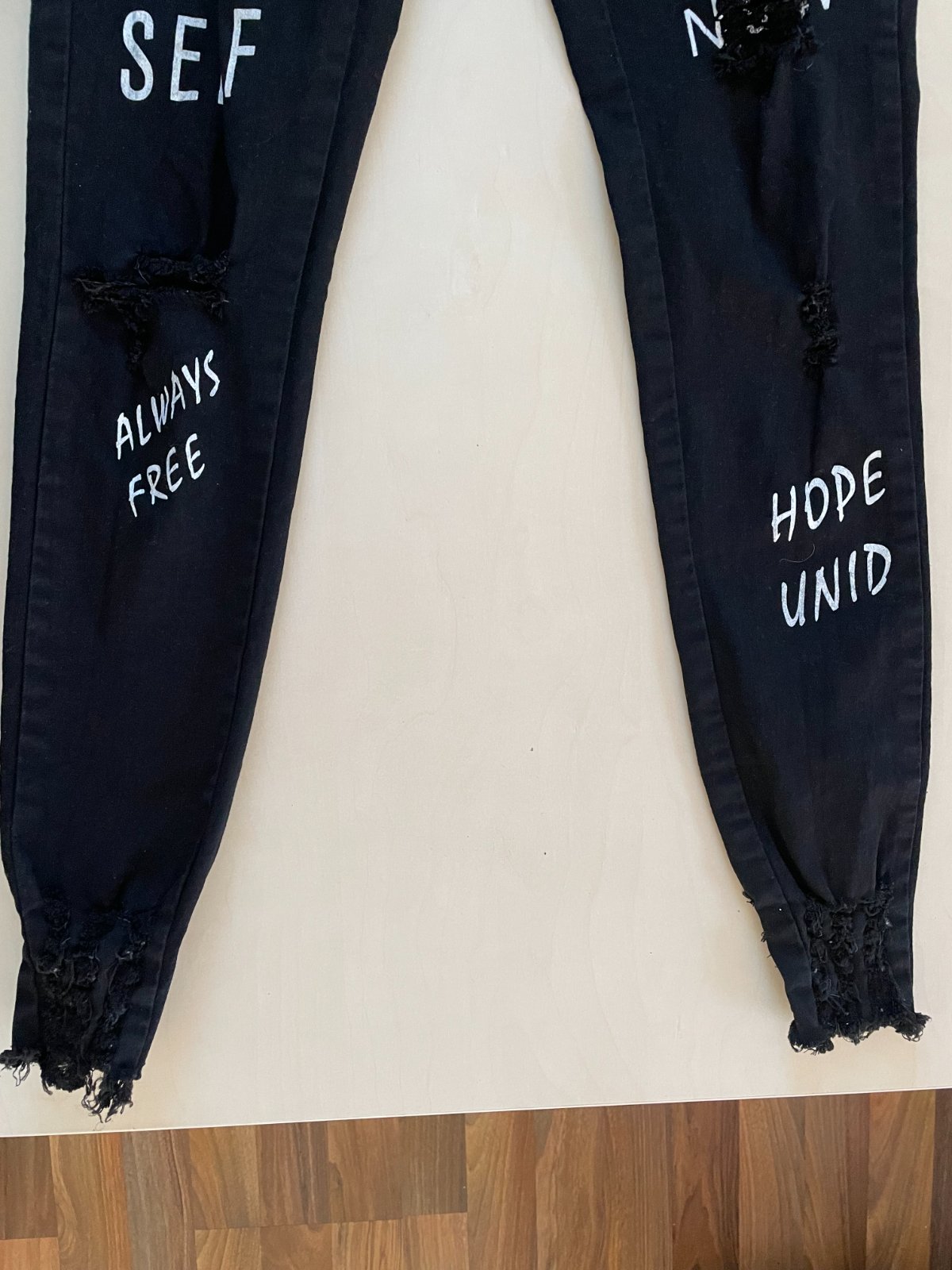 hol. nabízím k prodeji tyto černé děrované a dřené džíny s nápisy, vel 38 a 28 mex, sjou pružné ale nosila dcer při S, měřte, délka 7/8 nebo menšíé postava, Miss RJ. Pružná džínovina - 75% bavlna, 23% polyester, 2% elsten. Nošené, bez vad, dření a díry součást viz fota, krásné