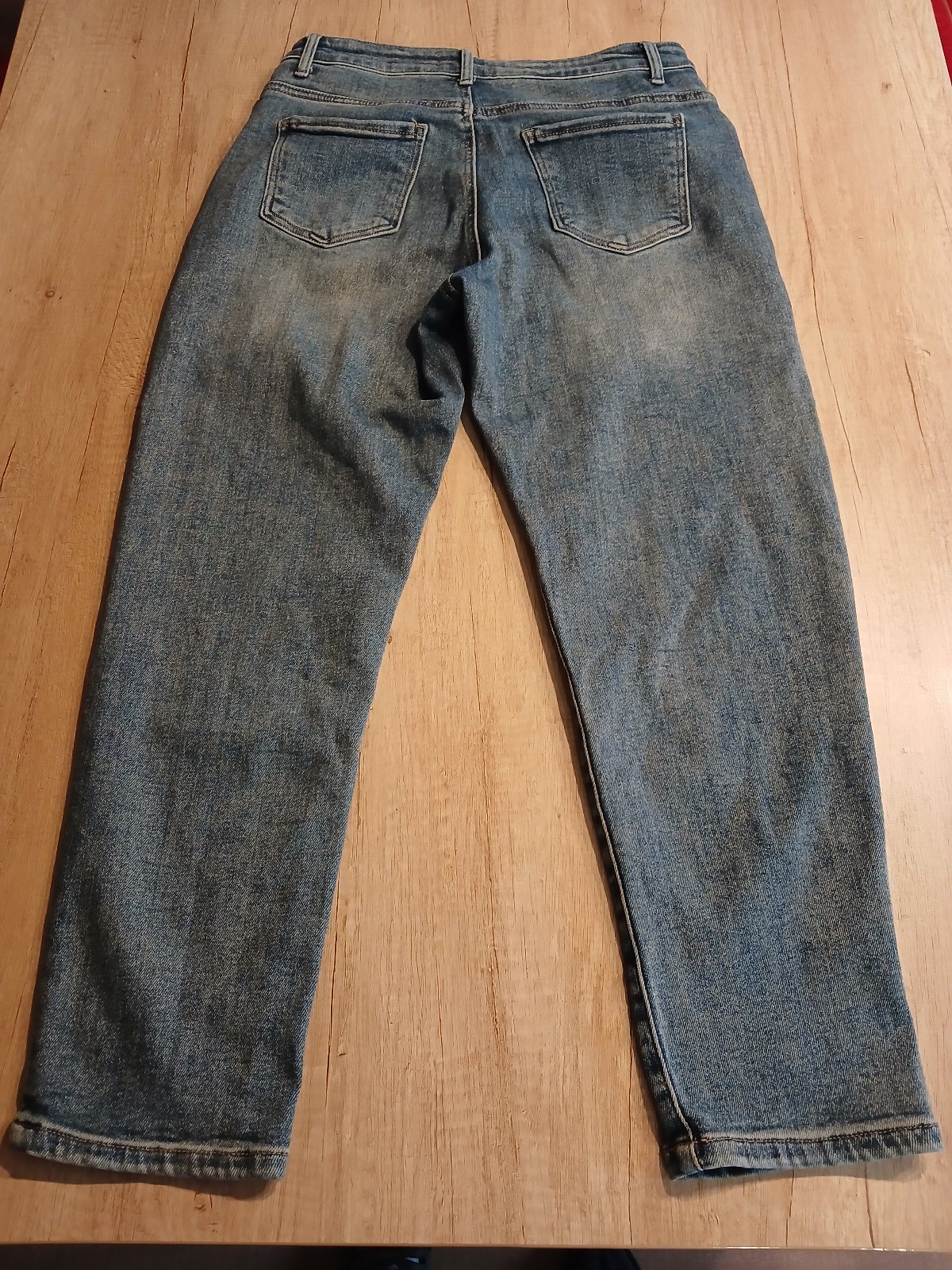 jsou nošené málo, jsou mi veliké, ze slabší pružné rifloviny, pod zadečkem jakoby vytáhlejší riflovina (na fotce je vidět) při nošení není vidět - je to v ohybu, dole maličko ochozené nohavice.