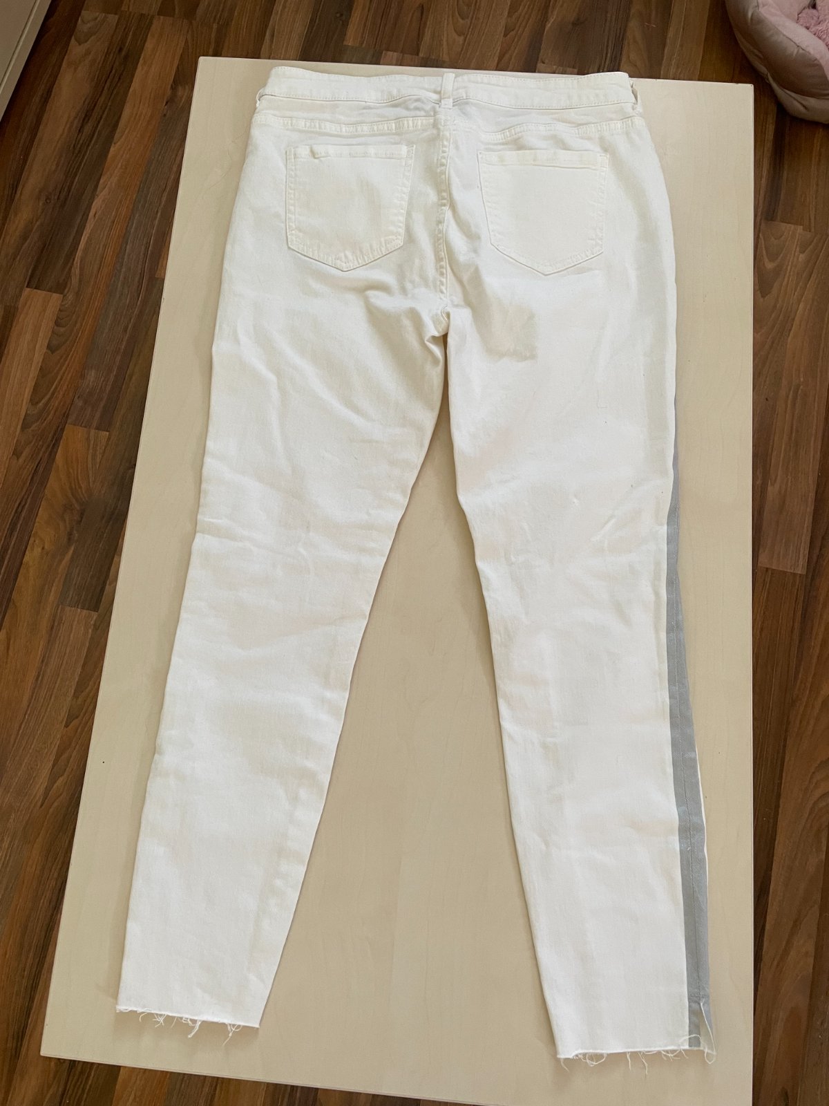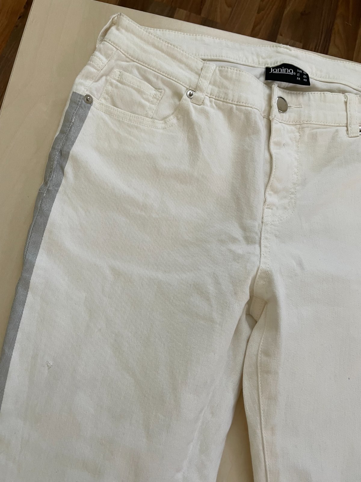 hol. nabízím k prodeji tyto bílé/lehce do krémova džíny s bočním stříbrným lampasem - mají v jedné části stehna malou dírku - možno zapracovat a úpravou přiznat, nebo zašít, vel 40 ale nošené i při M, měřte, jsou pružné, Janina. Jsou spíše pro menší postavu, nebo v kratší 7/8 délce - měřte! Dolní lem bez založení, s přiznaným třepením a bočními rozparky. Na stranách stříbrné pruhy. Nošené, bez vad jen ta dírky, krásné