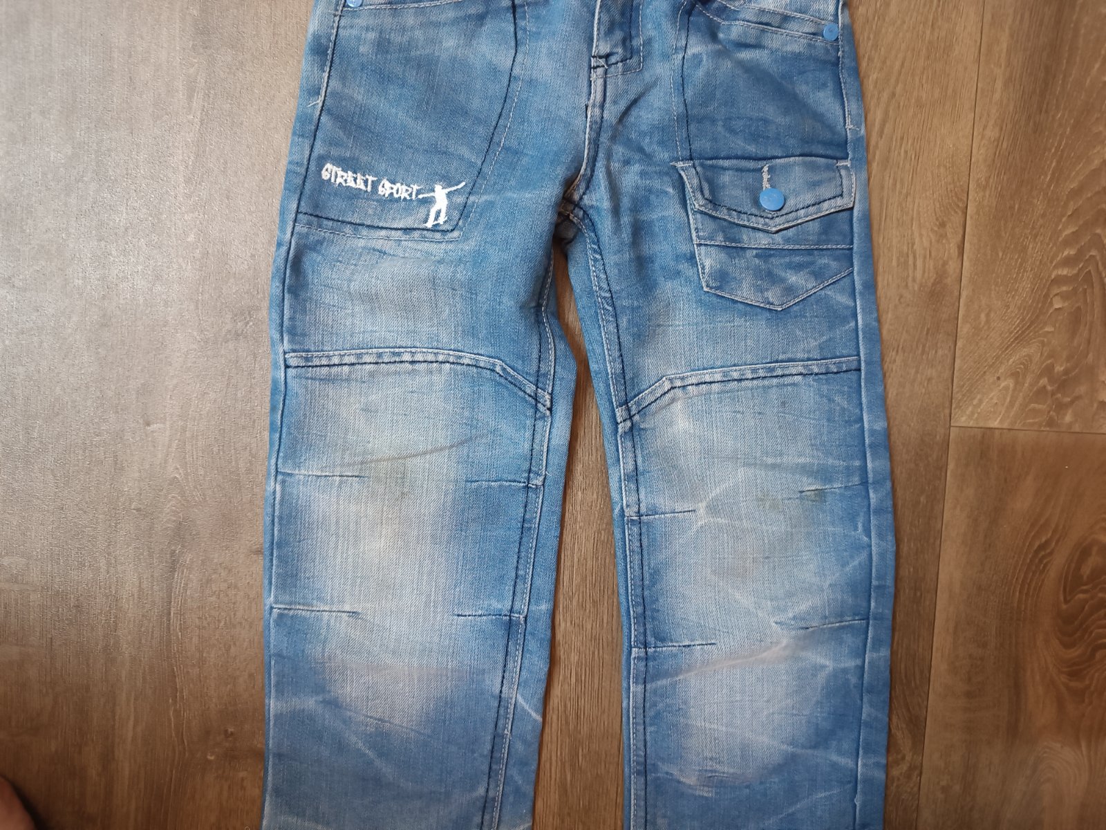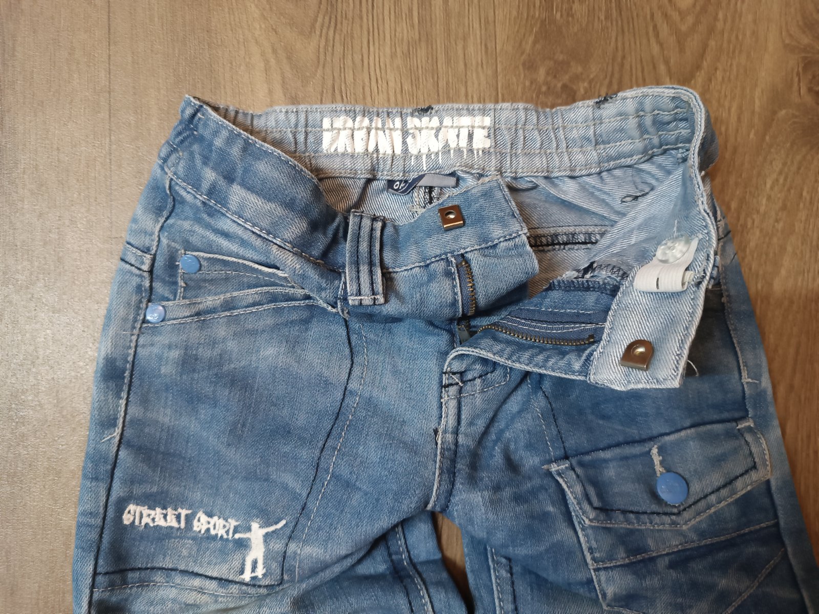 Darují chlapecké džíny, zn. Okay, vel. 116, s regulací v pase. S motivem Street sport, skate. Zapínání na zip+ patentka. V pase úchyty pro případný pásek. Džíny jsou v pořádku, jen na kolenou lehce od trávy (viz poslední foto), třeba ale ještě někomu poslouží.