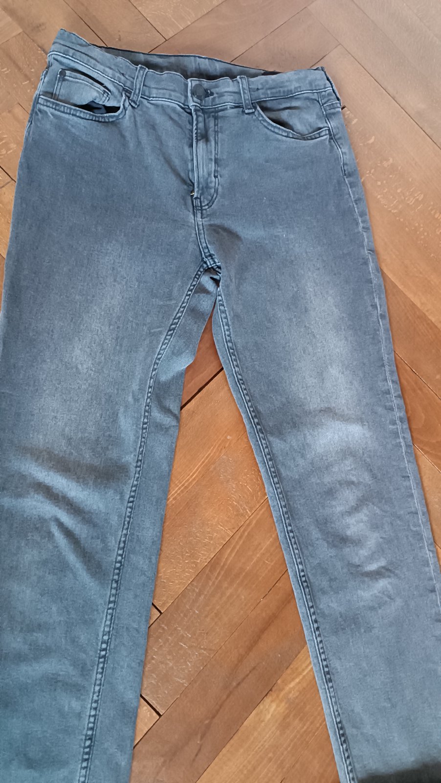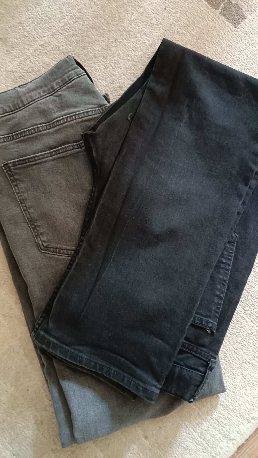 Dvoje rifle z HaM,oboje vel.170, běžné nošené cca půl roku jedním dítětem,velmi dobrý stav, jen tmavě mají na zadku jednu malou vytaženou nitku - viz.posledni foto. Barvy na fotkách úplně neodpovídají - tmavé jsou vyloženě černé,světlejší je jakoby "vyšisovaná" tmavší šedá,nejlépe vidět na předposlední fotce
