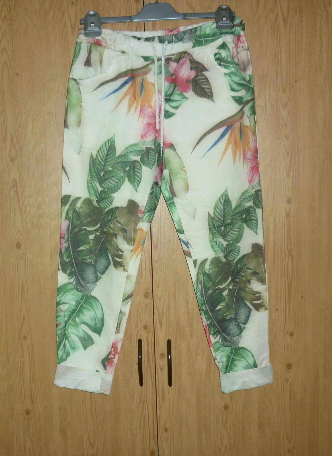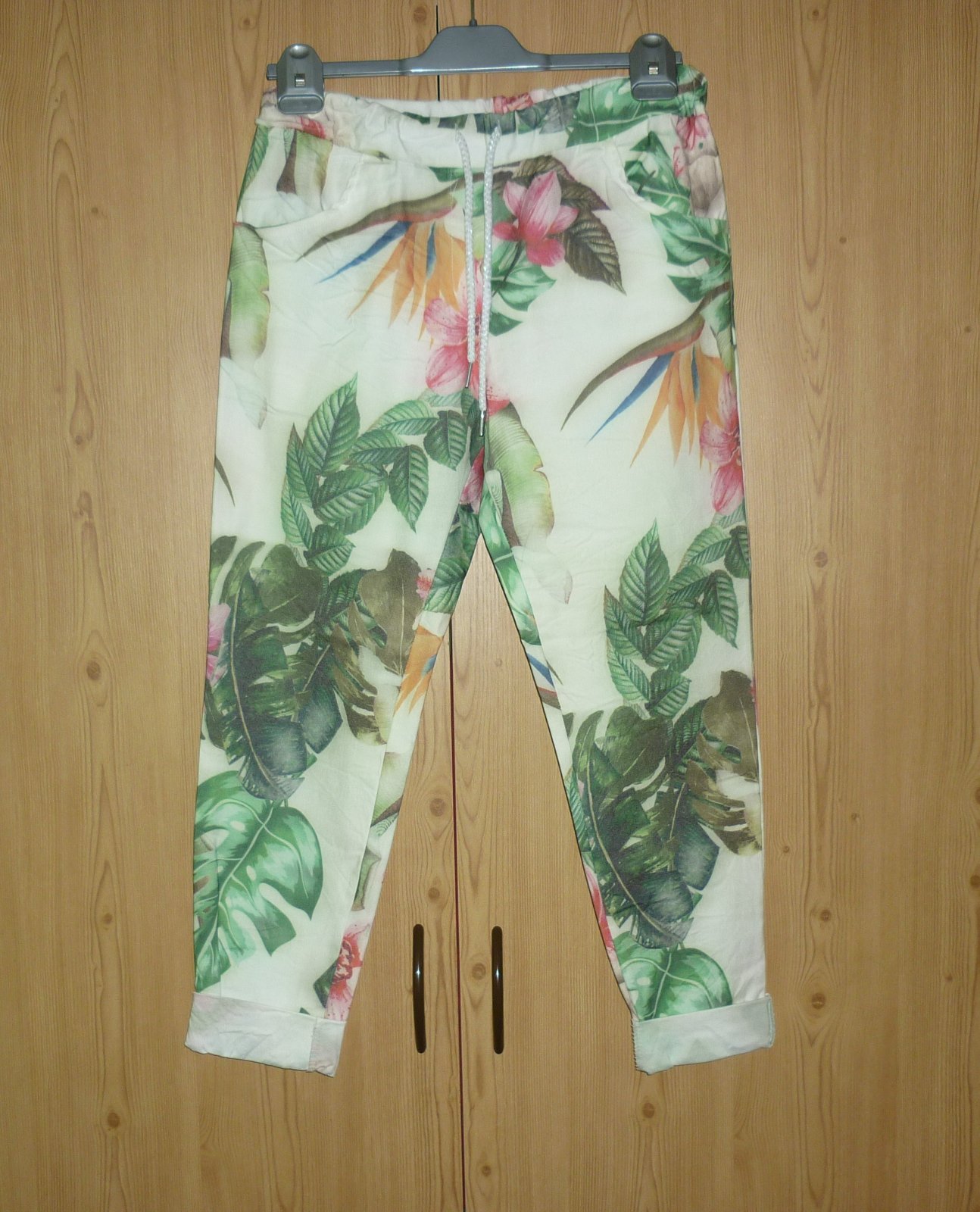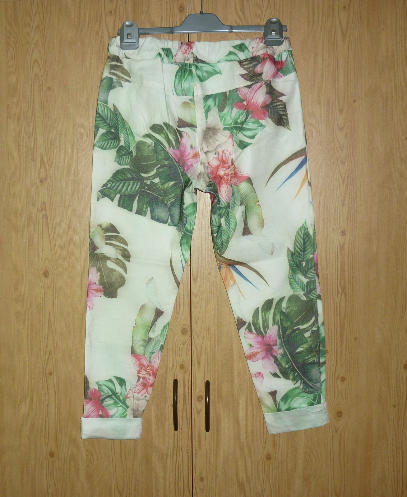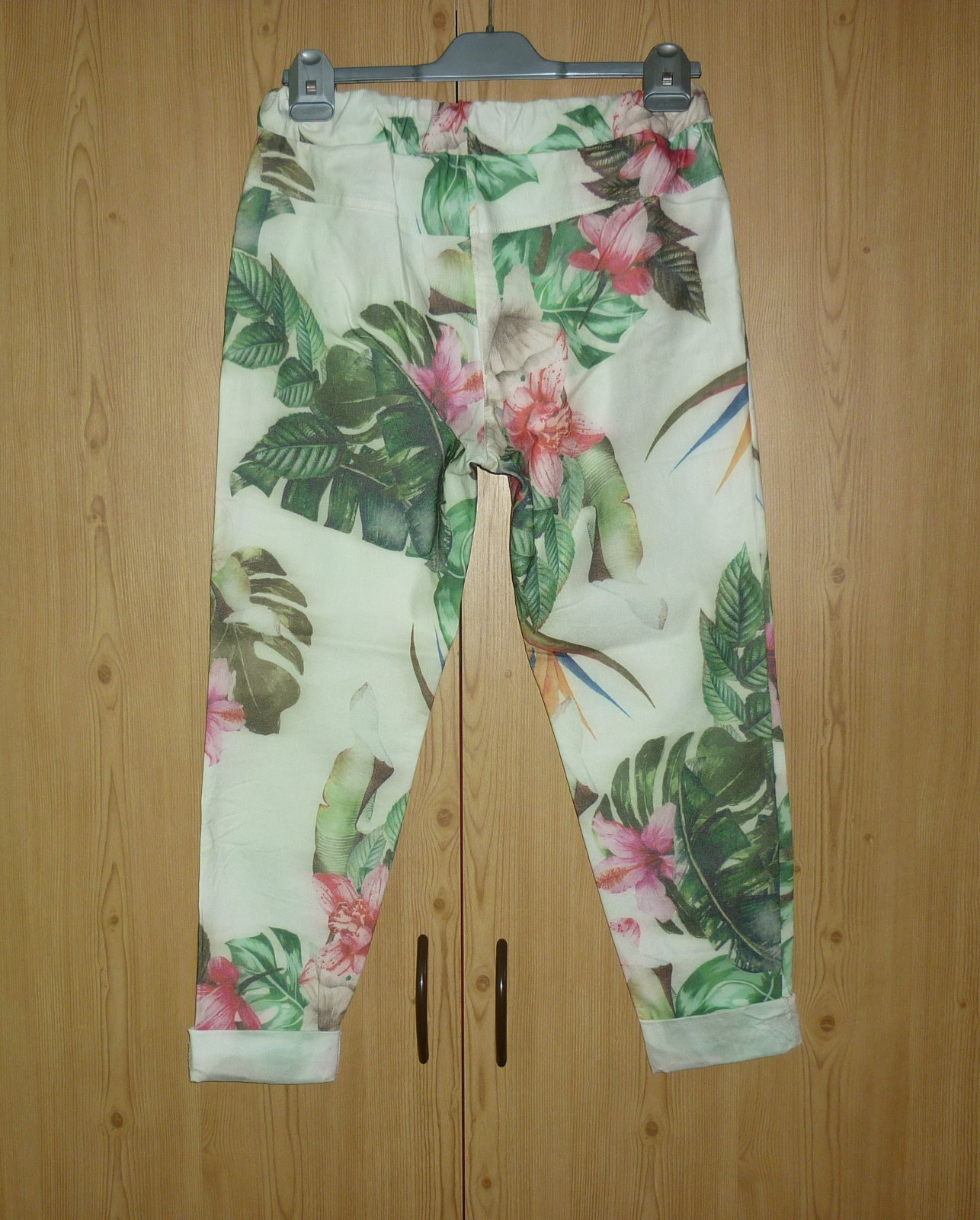 Prodám volnočasové 7/8 kalhoty Moda Italia, nové, nenošené, pouze bez papírové visačky. V pase guma a šňůrka na stáhnutí, vpředu nahoře 2 vnitřní kapsy, nohavice dole jsou na 2x ohrnuté. Materiál velmi pružný: 75% viskóza, 20% polyester a 5% elastan. Velikost není uvedena, odpovídá cca S/M. Rozměry: pas v klidu 36cm x 2, pas v natáhlém stavu 53cm x 2, šířka nohavice v místě rozkroku 29cm x 2, šířka nohavice v místě kolene 20cm x 2, šířka nohavice dole 14cm x 2, vnější délka nohavice 88cm + 9cm v ohrnutí, vnitřní délka nohavice 62cm + 9cm v ohrnutí, přední sed 28cm, zadní sed 38cm. Cena: 190,-Kč + poštovné. Koukněte na moje další inzeráty, třeba si něco vyberete a ušetříte na poštovném. Tel.: 728 455 567