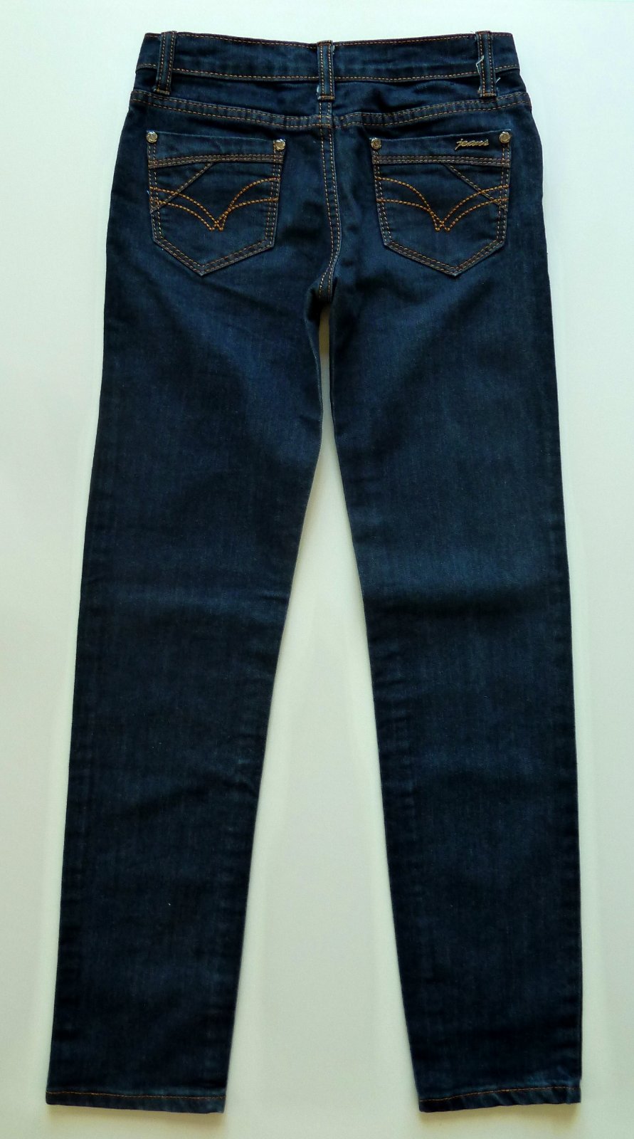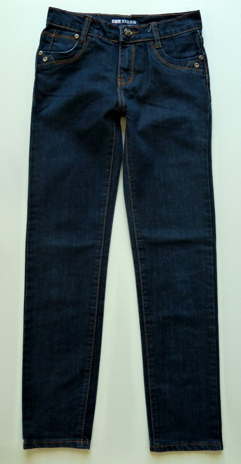 Modré rifle zn. H.L. XIANG, kovový knoflík, zip, poutka na pásek, přední a zadní kapsy s kovovými peckami a výšivkou, dvojité kontrastní prošívání.