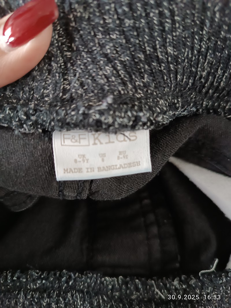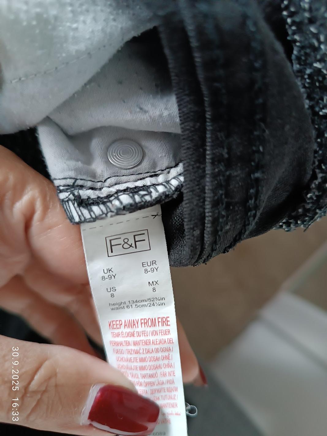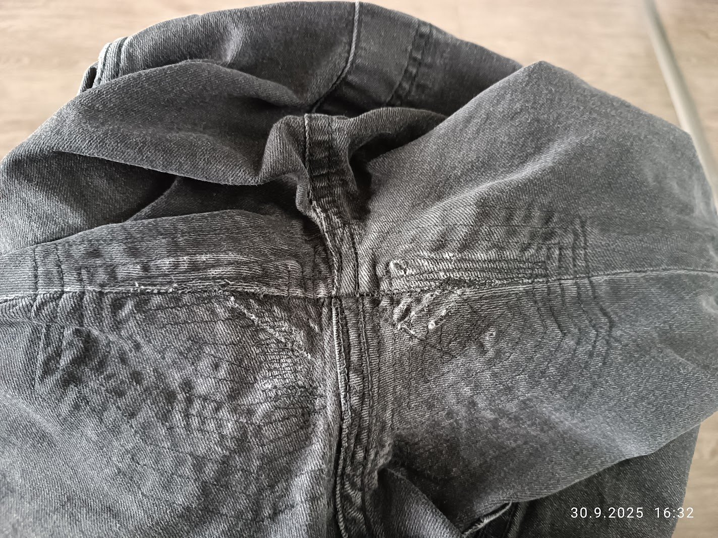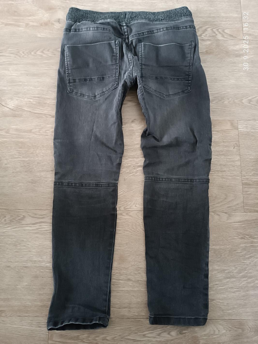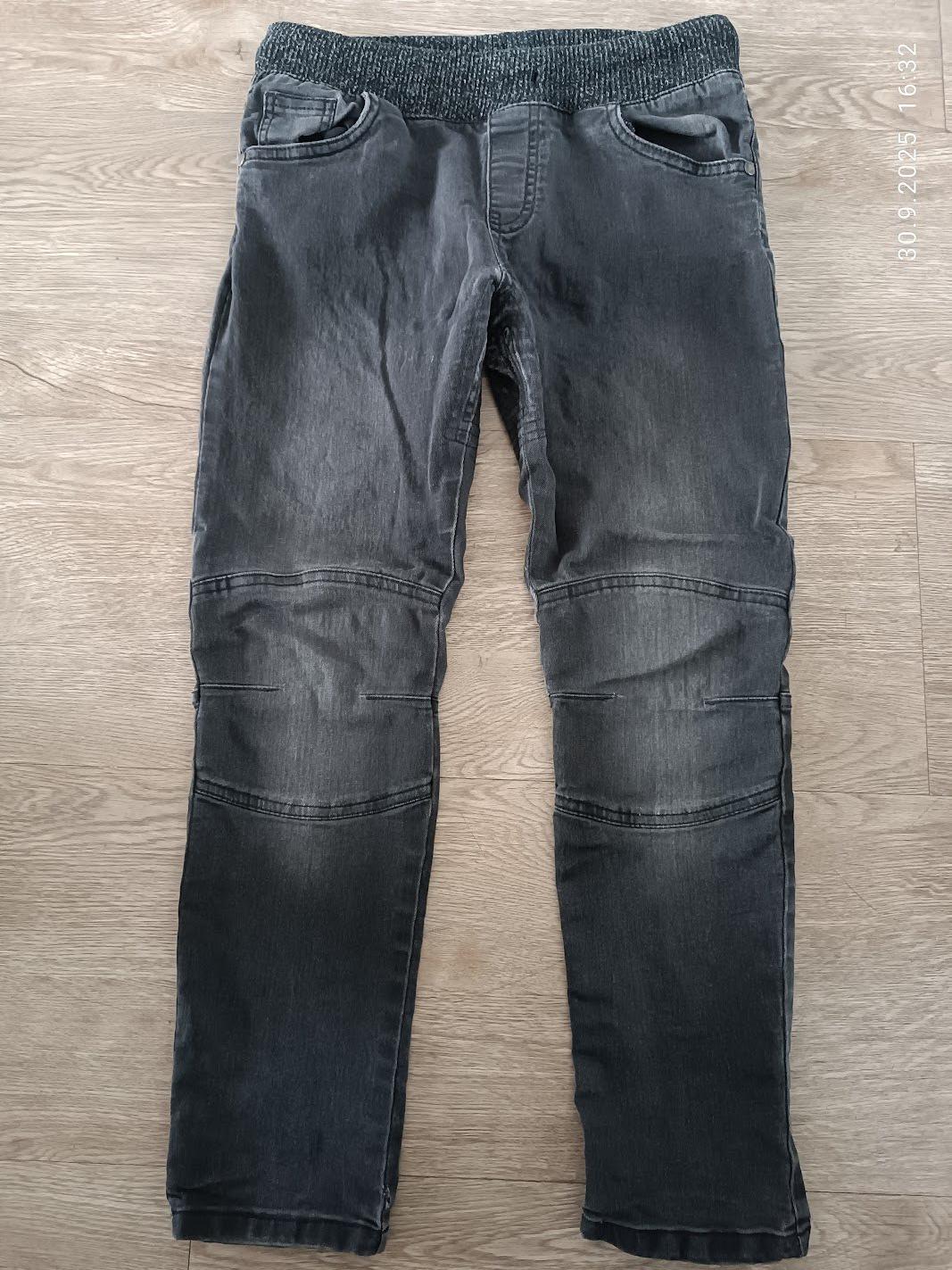 Džíny pořád pěkné, poslouží ještě hodně. Viz nit trhlá na nohavici. Velikost 134/140. Světlá černá.