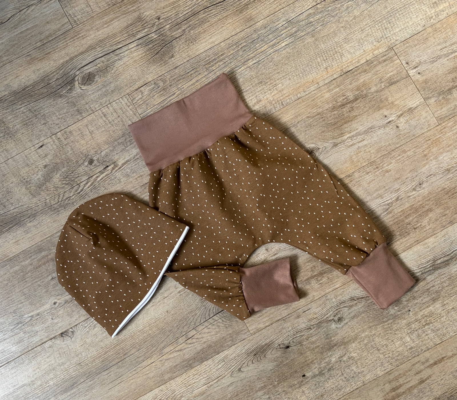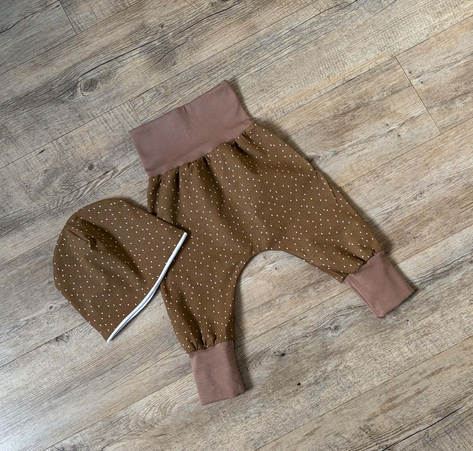 Tenké Baggy. Délka 47 cm. Měřte 😉. Čepice dvouvrstvá.