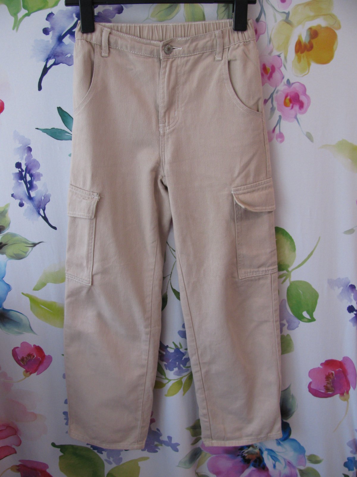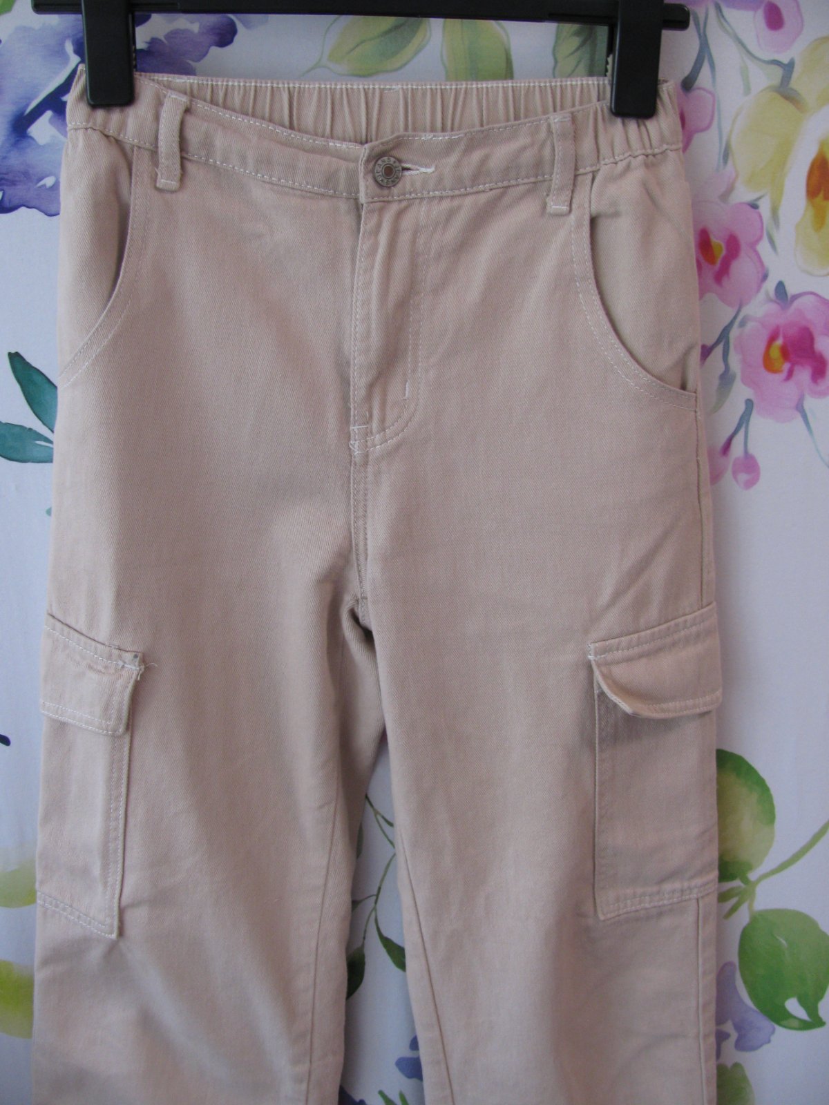 Hezké béžové džínové pohodlné Cargo kalhoty,v pase do gumy, přední ,zadní kapsy, kapsy na nohavicích, zap. na zip a drukový knoflík, 100% bavlna. Malinký flíček na špičce kapsy-viz foto, jinak bez vady ,krásný stav.