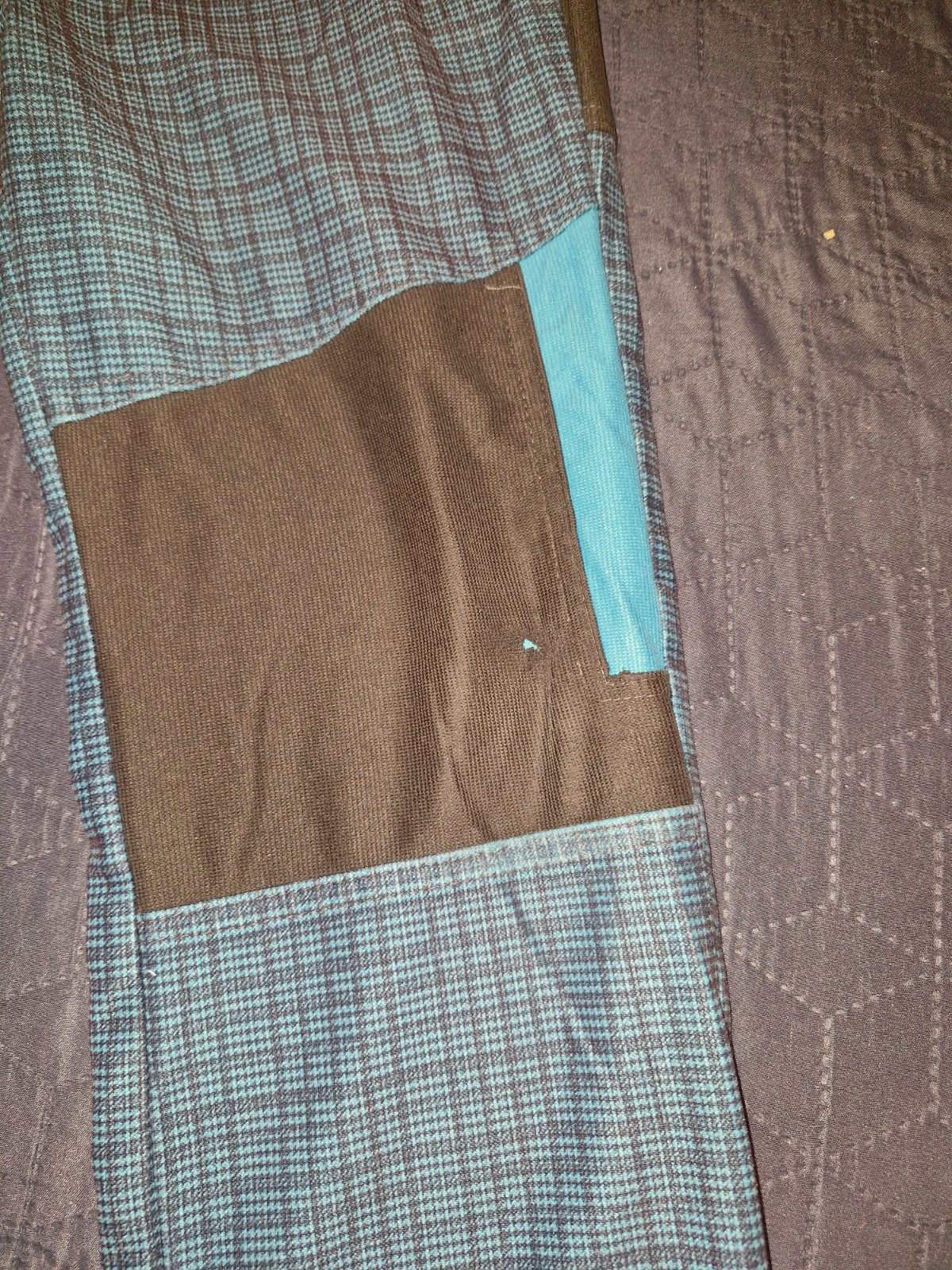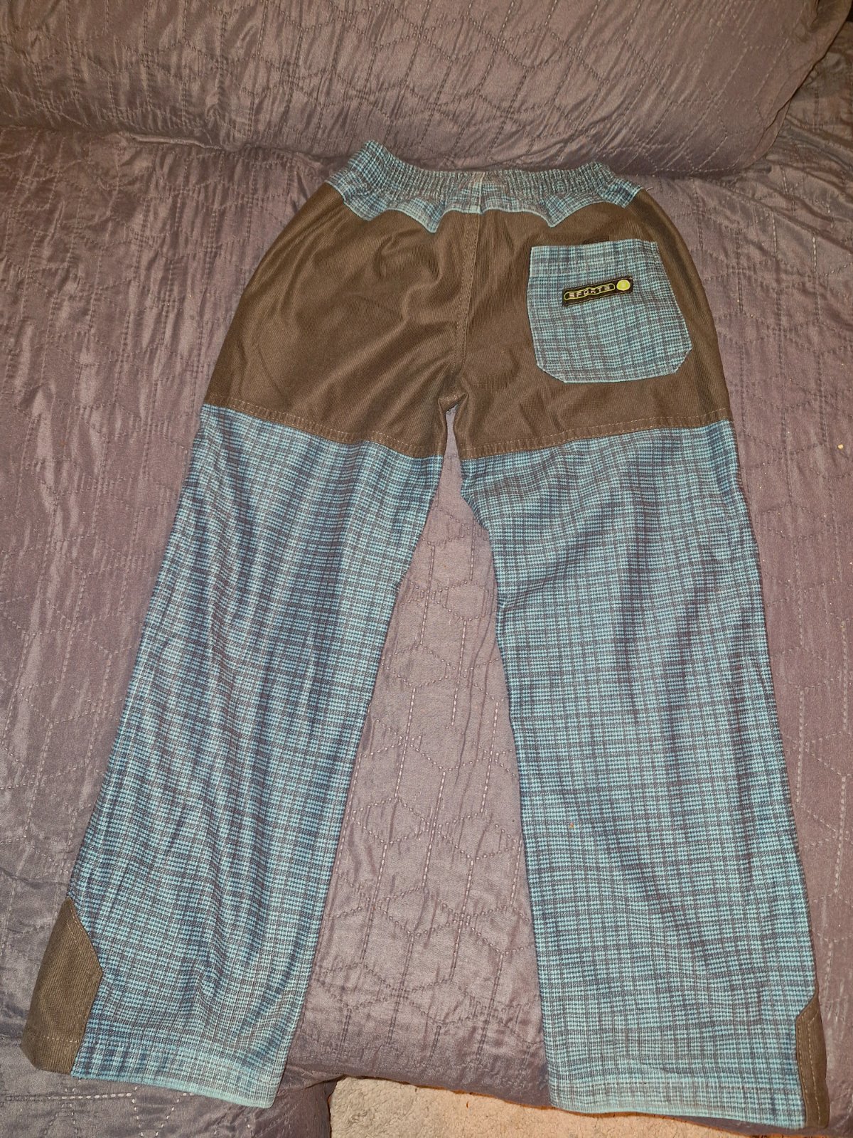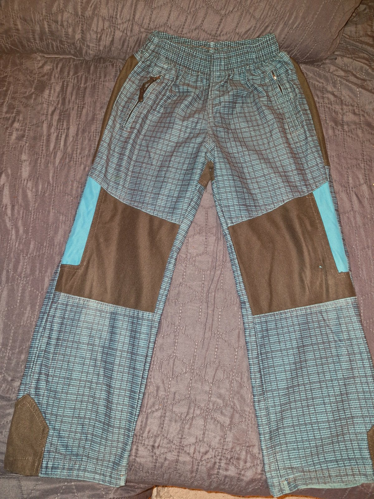 Prodám lehké modré kalhoty ve velikosti 122. V pase na gumu, dvě kapsy z přední strany, jedna kapsa ze zadní strany, na jednom koleni malá dírka (šikovná maminka si s tím určitě poradí).
