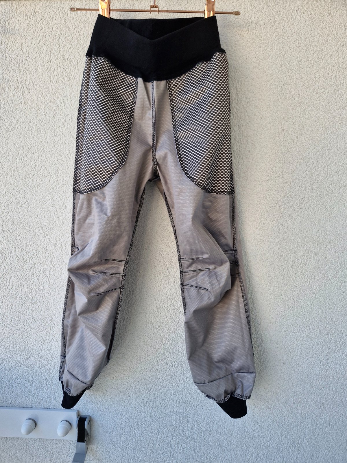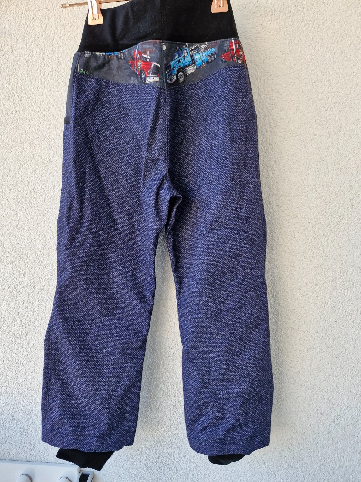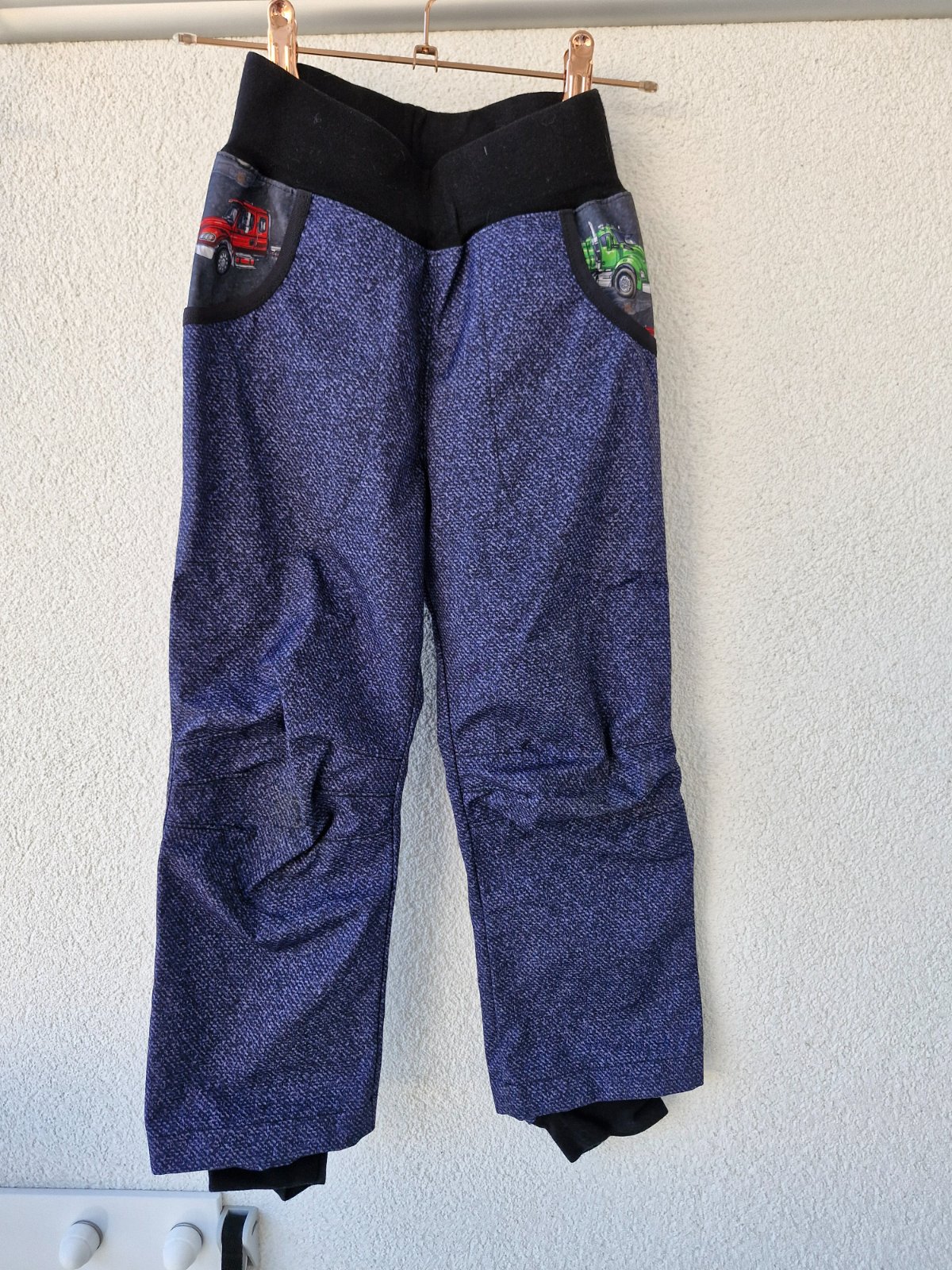 Softshelky z kombinace letního a jarního softshellu, ve vzhledu džínoviny. Mnou šité takže originál (synem nošené). Odpovídají cca velikosti 116, pas 25,5 cm, 44,5 cm, celková délka 68,5 cm, ale díky řešení spodního okraje vydrží i více velikostí. Na kolenou mají odřeninky viz. foto - oranžově označené, ale jsou jen v horní vrstvě látky (nejdou skrz).