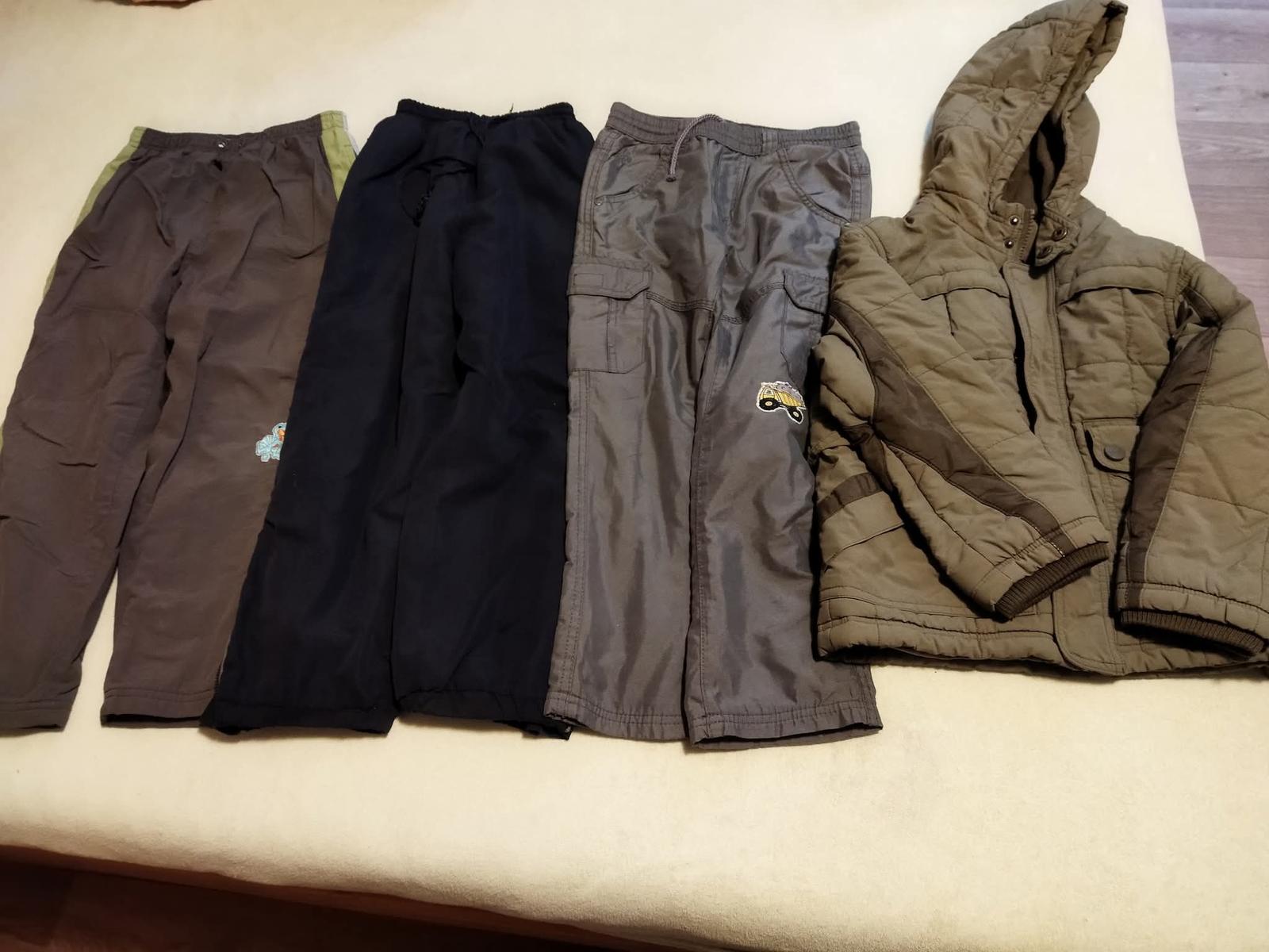 Oblečení má drobné vady, (dírky opravené nášivkou), kalhoty jsou podšité fleecem (ty šedé) modré jsou teplejší..na zahradu, do školky ještě hodně poslouží, velikost 116..za celek 100kc, lze i jednotlivě