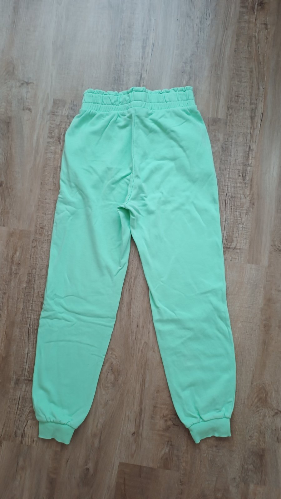 Tepláky jsou nošené jen doma, jsou uvnitř s chloupkem. Mají boční kapsy. Barva je reflexní zelená. Celková délka 90 cm, vnitřní strana nohavice 68 cm, pás v klidu 30 cm, po natažení 40 cm.