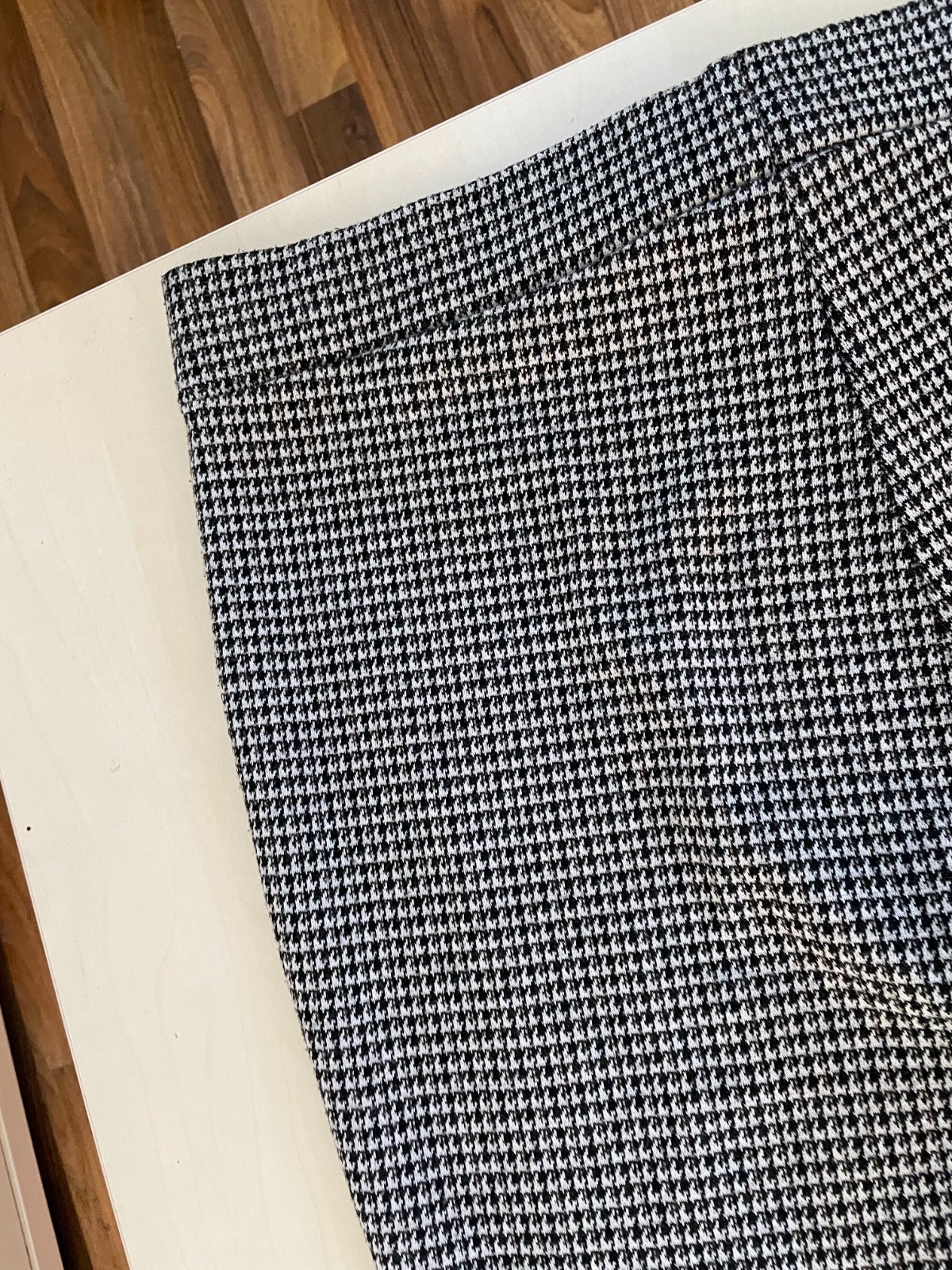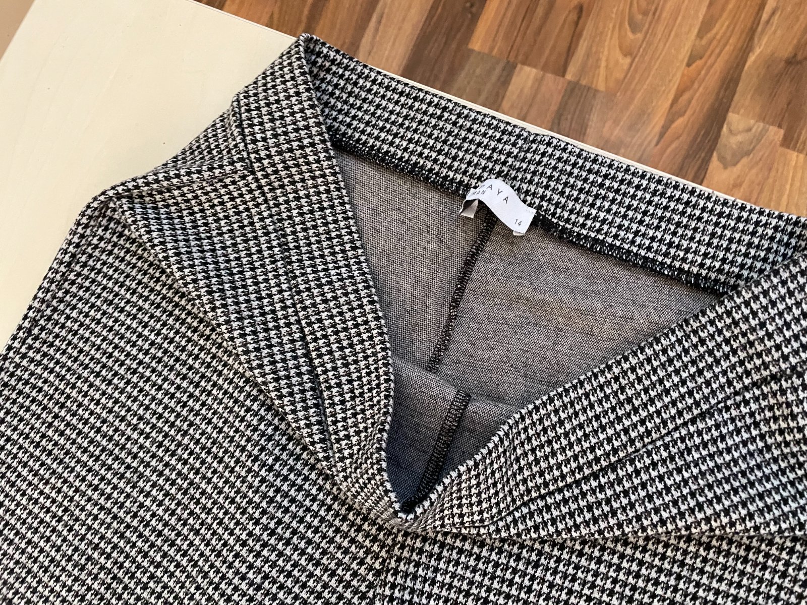 let. nabízím k prodeji tyto vzorované kalhoty, vel 14 tedy cca XL, měřte, Papaya. Vzor podobný jako kohoutí stopa, Pas guma, nepruží moc, je silná. Materiál úpletový, má takový chloupek, dáno i tím materiálem. 76% poylester, 19% viscoza, 5% elasten. Nošené, bez avd, krásné