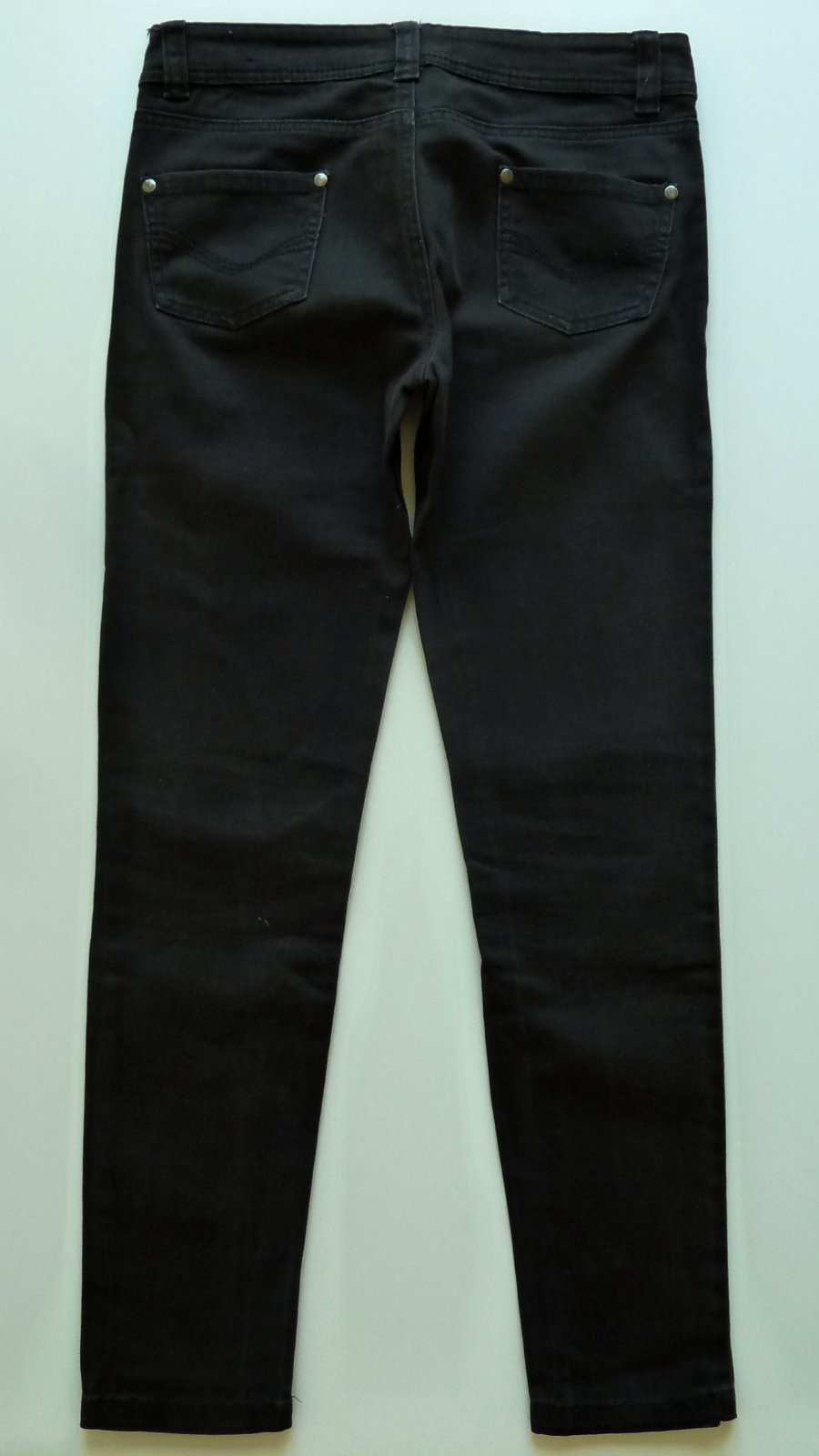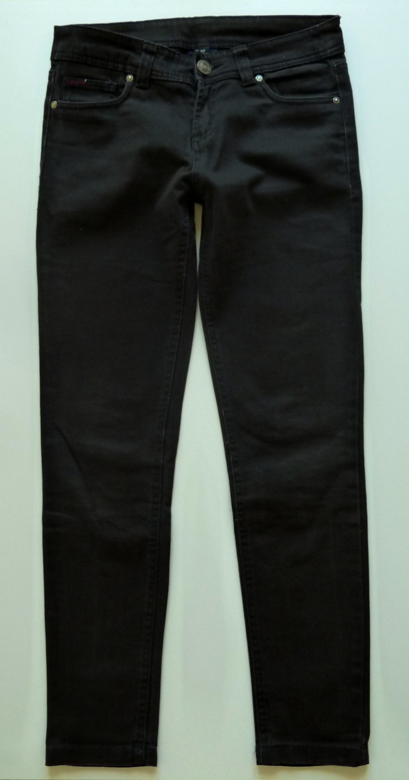 Černé pružné rifle zn. CRASH ONE, kovový knoflík, zip, poutka na pásek, přední a zadní kapsy s kovovými peckami a výšivkou, dvojité prošívání.