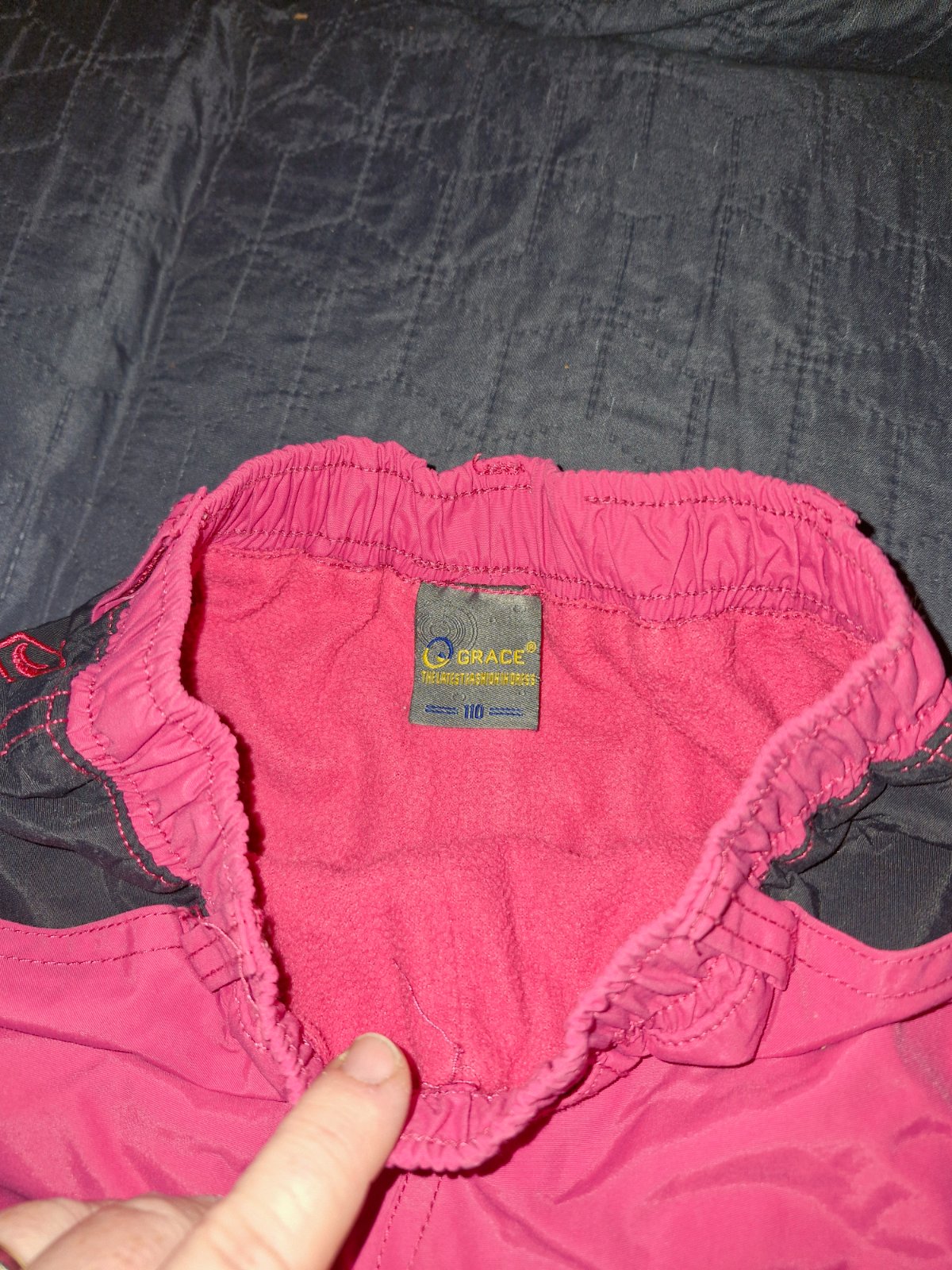 Prodám růžové zateplené kalhoty značky Grace ve velikosti 110. V pase na gumu, dvě kapsičky z přední strany. Ve velmi dobrém stavu