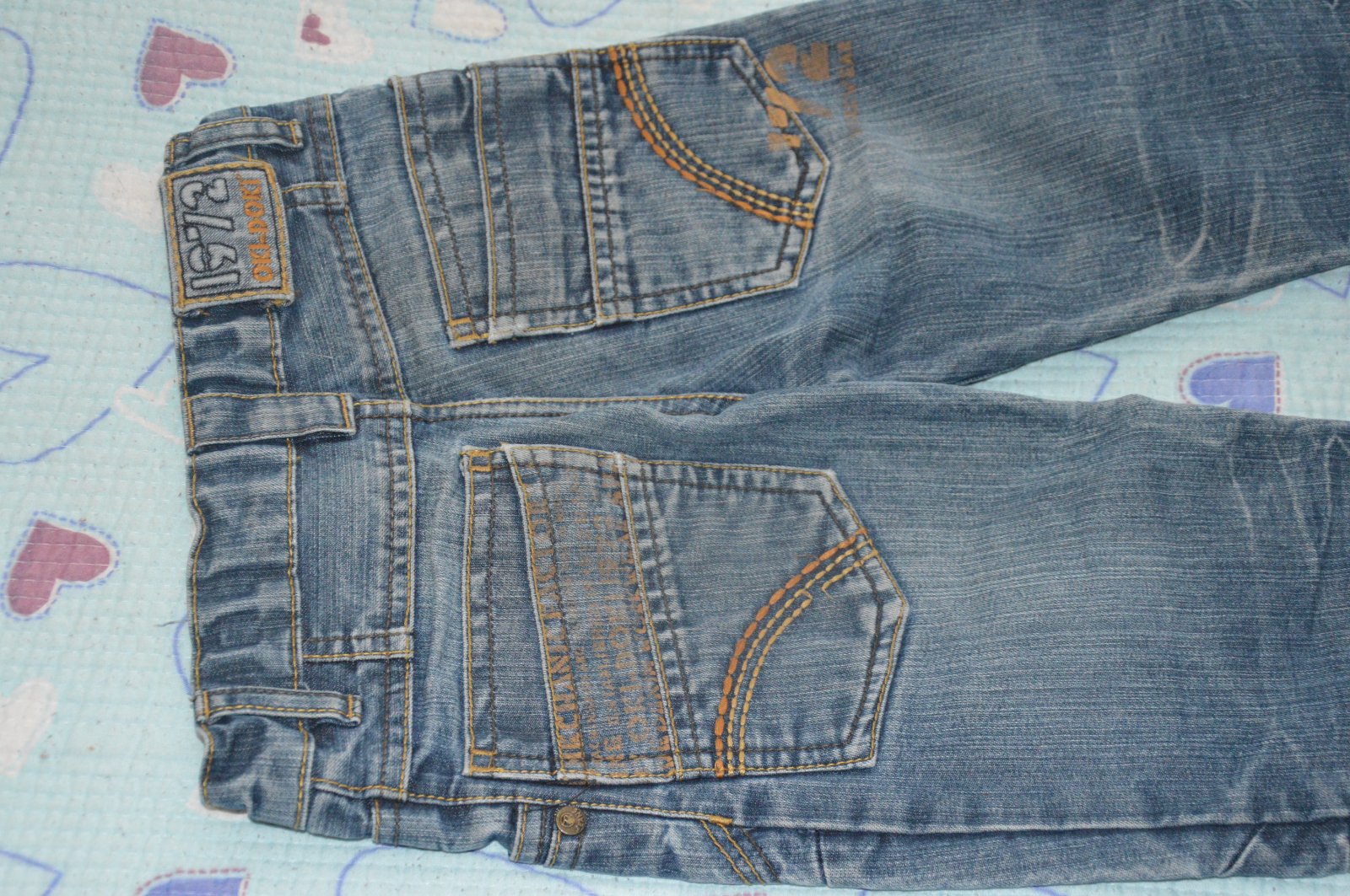 Bavněné klasické džíny. 100%bavna, vyřazuji nastejno s ostatními kalhotami vel 116/122. V pase lze upravit šířku regulační gumou, jednodušší oblékání - na háček. Supr střih, slušivé, proto intenzivně nošené, kolena opravovaná spodní záplatou a štupováním.