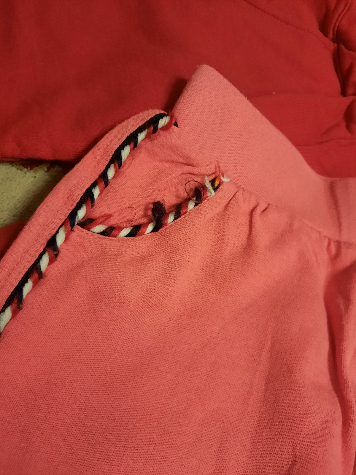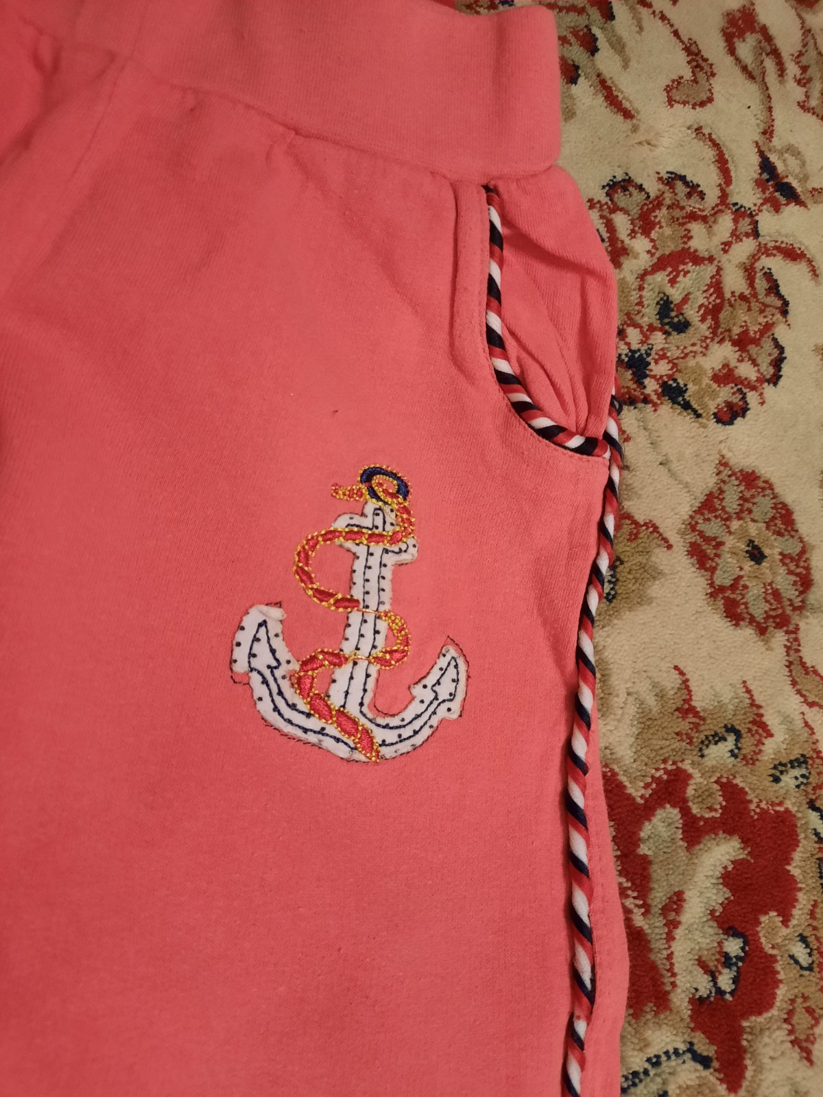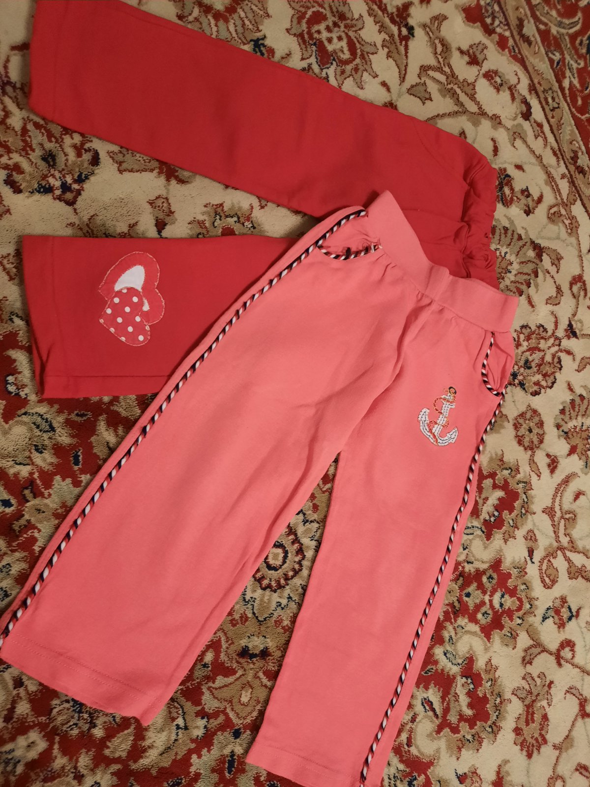 Daruji dvoje tepláky. Se srdíčky, skoro nenošené, ale zašitá drobná dírka na zadečku, povolil šev, kotvové - vytažené nitky viz foto.