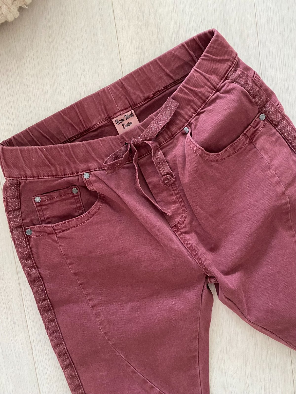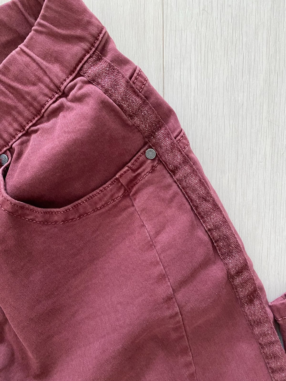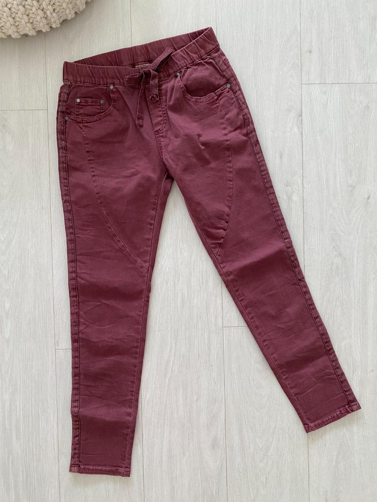 V pase na gumu, v tunýlku třpytivá šňůrka stejná jako na bocích nohavic.