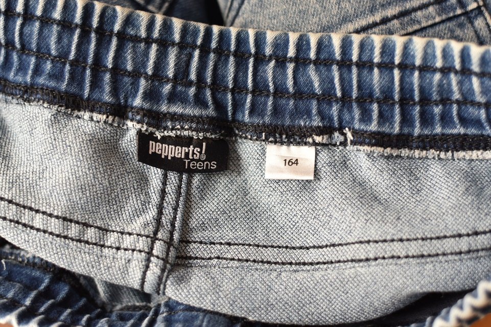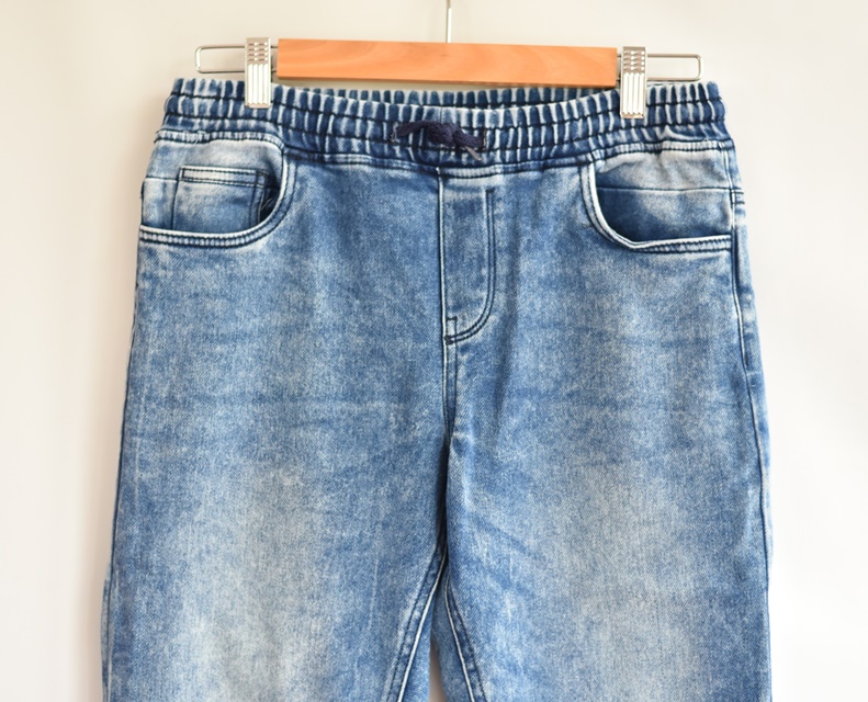 Pružné, v pase guma, šňůrka funkční. Chybí jedno zakončení tkaničky.