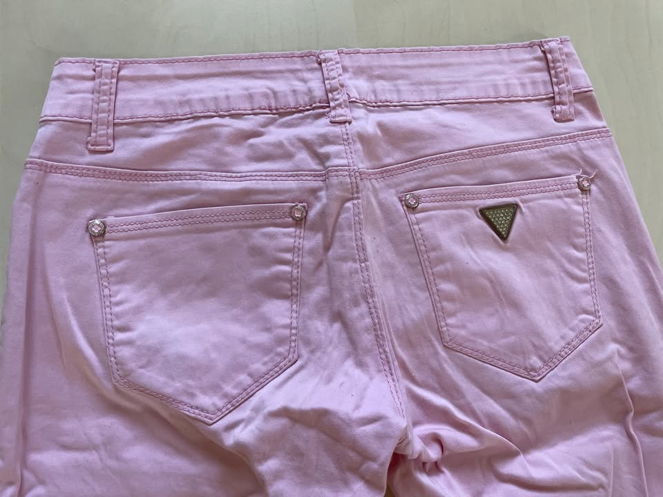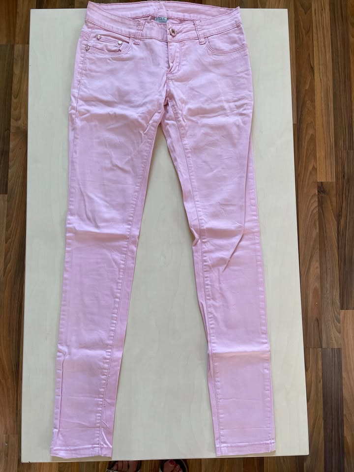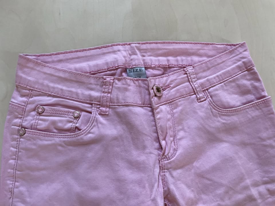 2467. nabízím k prodeji tyto růžové kalhoty, vel 27, nošené při XS/S. Materiál celkem pruží. Dozdobené cvoky s růžovými kytičkami. Materiál 95%bavlna, 5% elasten. Nošené, bez vad, krásné