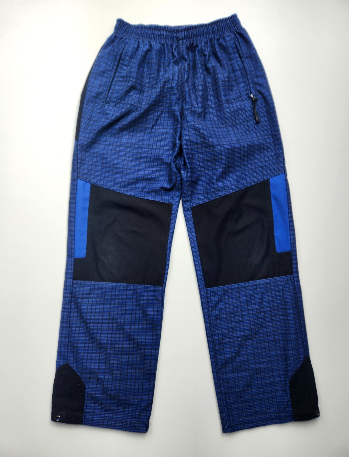 Kostičkované textilní sportovní kalhoty v modro-černých barvách s černými díly zn. SPORTS, pas do široké ploché gumy, přední kapsy na zip, zadní kapsa na suchý zip.