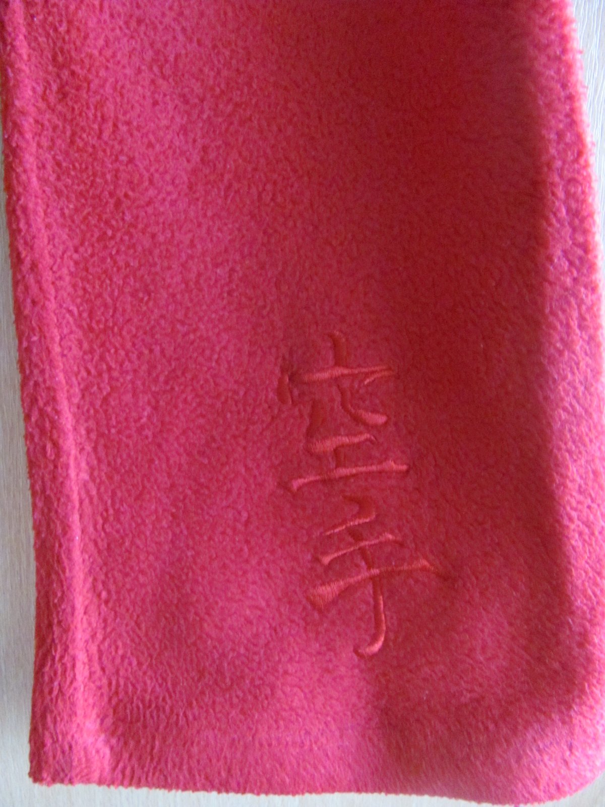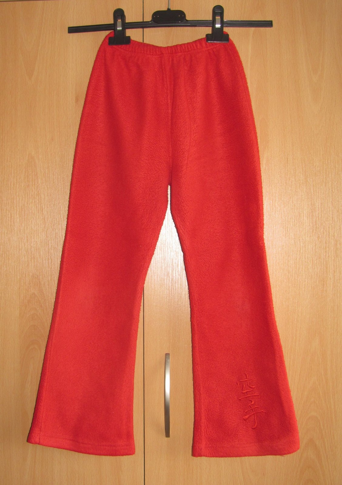 Červené flaušové kalhoty, v pase guma, aplikace - výšivka na nohavicích. Velikost 128, pas 20 - 32 cm, délka 70 cm.