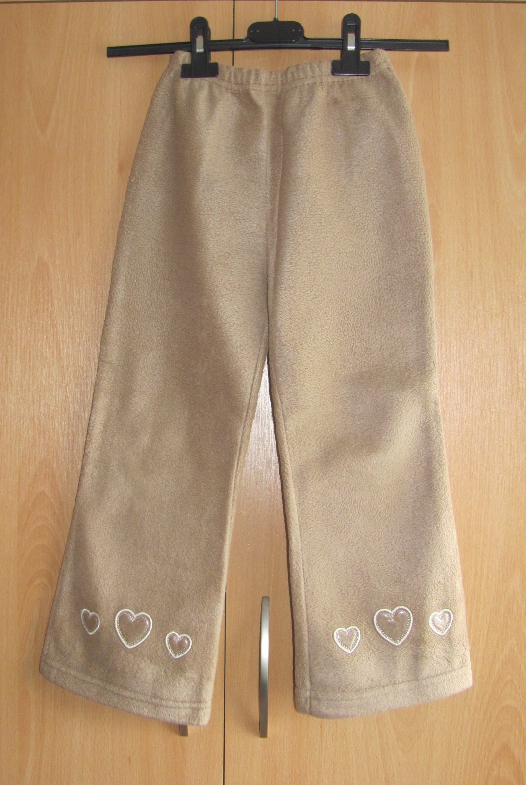 Hnědé flaušové kalhoty, v pase guma, aplikace na nohavicích. Velikost 122, pas 22 - 32 cm, délka 65 cm.