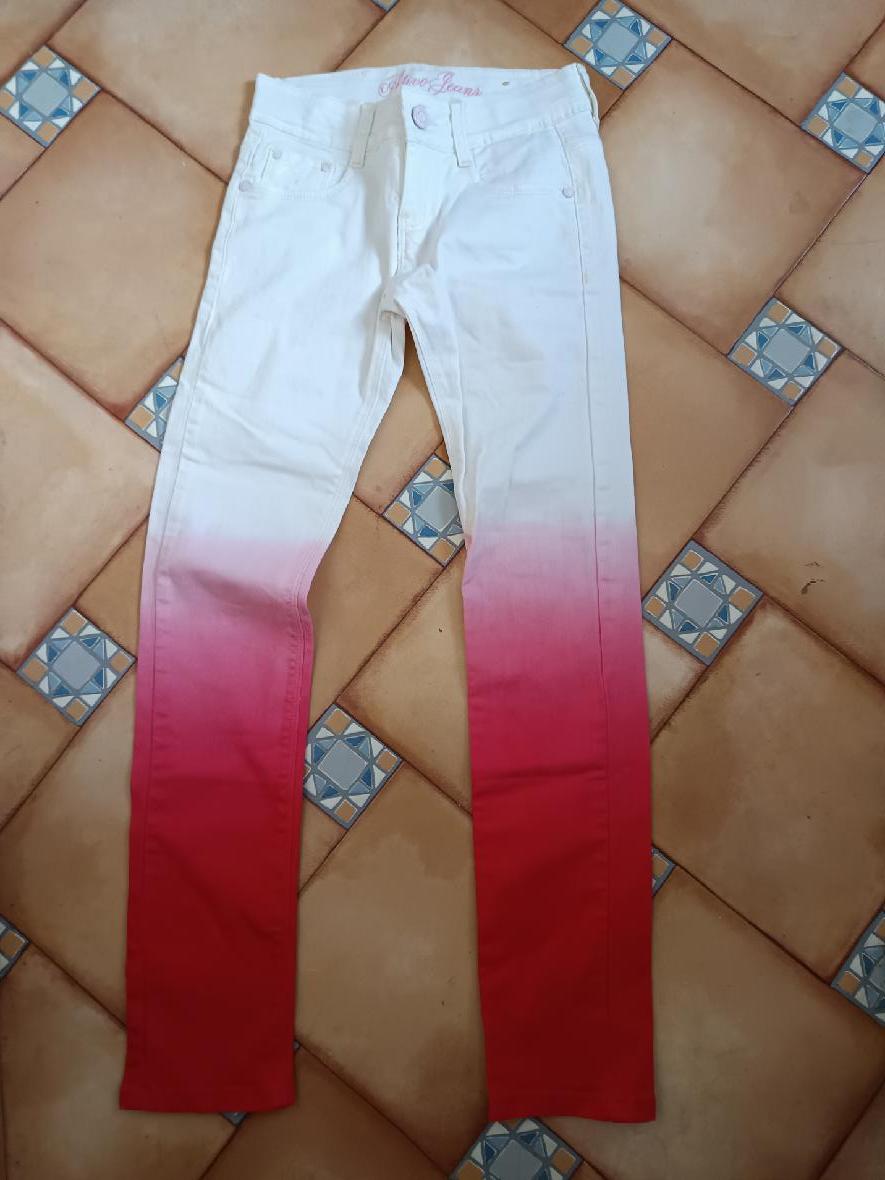 Nošené džíny, mají flíčky, více na růžových, cena dohromady.