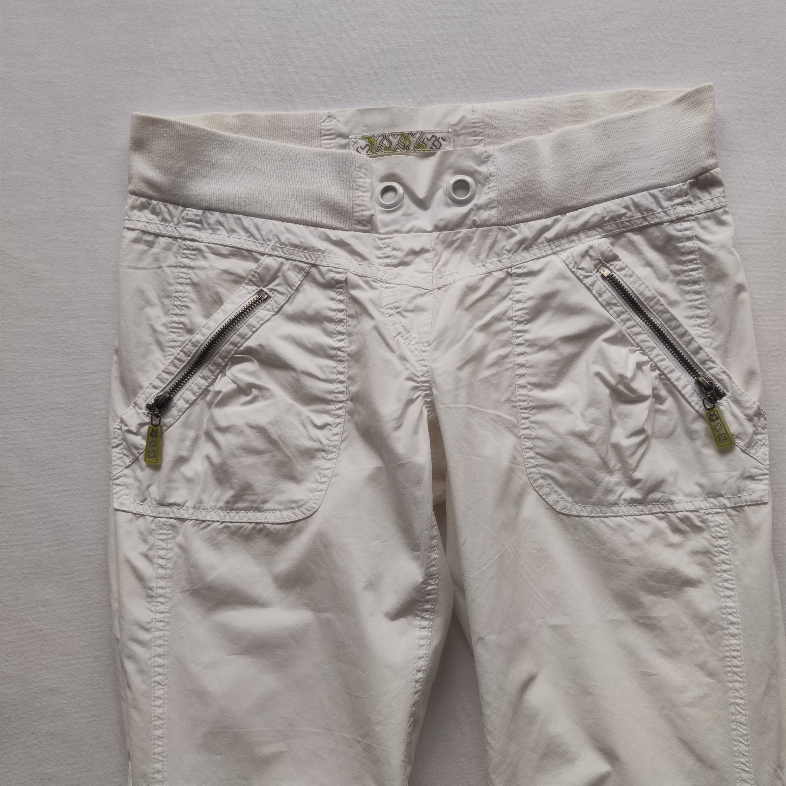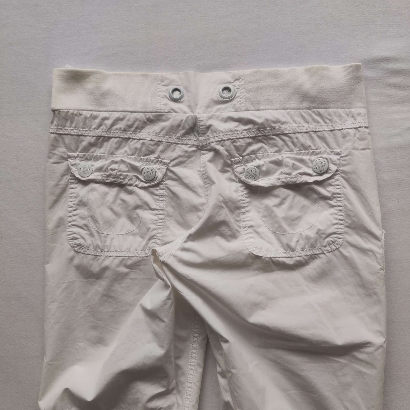 Nabízím dámské bílé, volnější, letní kalhoty s nižším sedem, 100 % bavlna podle mě bavlna, uvedená velikost 38, zn. Crazy World. V pěkném stavu, neošplapané. V pase je guma (celý tenkém pasu je pružný), 6 kapes (zipy se dají rozepnout, vytvoří další kapsy). Postranní délka 107 cm, od rozkroku cca 85 cm, šířka v koleni cca 23 cm, v lemu nohavice cca 25 cm, šířka pasu 44 cm, přední sed 21 cm, zadní 36,5 cm. Zásilkovna 89 Kc, Balíková 75 Kč, osobní předání na P4 Chodov, P8 Palmovka nebo na metru C a B mezi těmito stanicemi po domluvě.