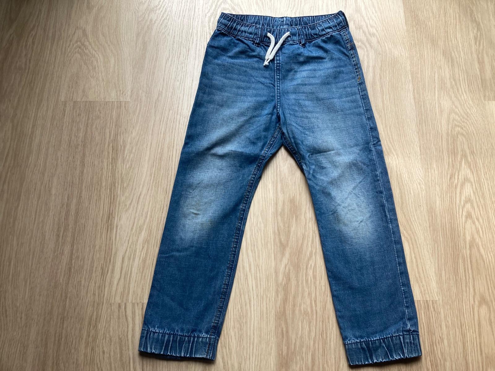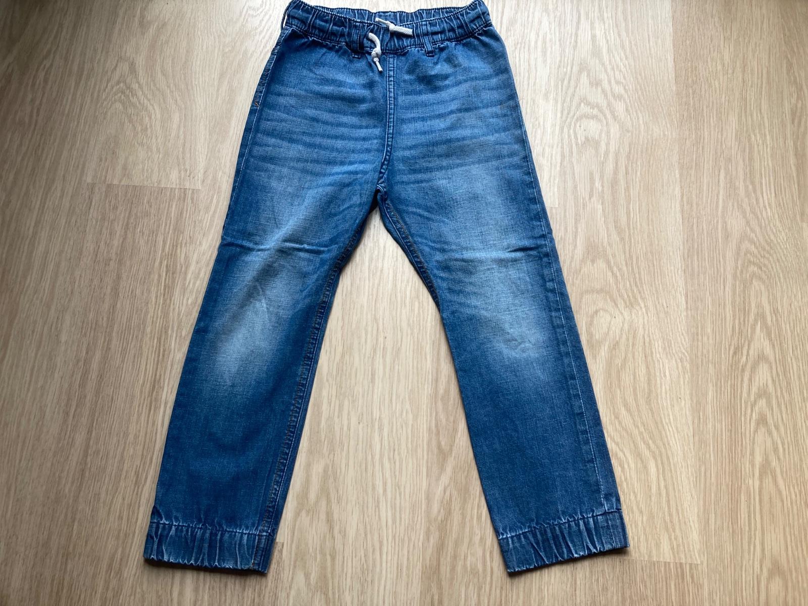 Tenké džíny, skoro jako pláťáky, jedno kolena lehká dírka a vybledlé fleky od trávy, dole v nohavicích není guma (vyndala jsem ji) a jde pak nosit i jako tříčtvrťáky ;-)