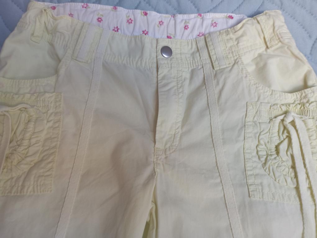 Plátěné kalhoty, v pase na gumu a šňůrku. Kapsy na bocích i nohavicích. Nohavice na gumu. Velikost uvedena 150, ale jsou spíš kratší, proto uvádím velikost 140. Jsou velmi pohodlné, bez vad, vzhled...