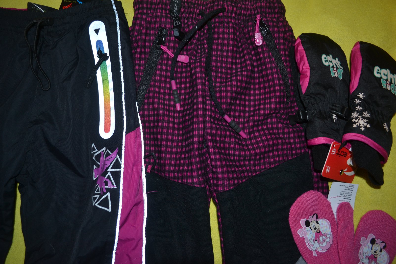 2x výborné osvědčené oteplené šus´tákové +bavlněné zimní kalhoty,pas na stažení,kapsy na zipy,uvnitř měkké hřejivé fleece,dole nohavice na stažení,příjemné,praktické,délka 56 a 57cm+ nepromokavé silné rukavice+ rukavice Disney,tato zvýhodněná cena je za všechny 4 věci celkem