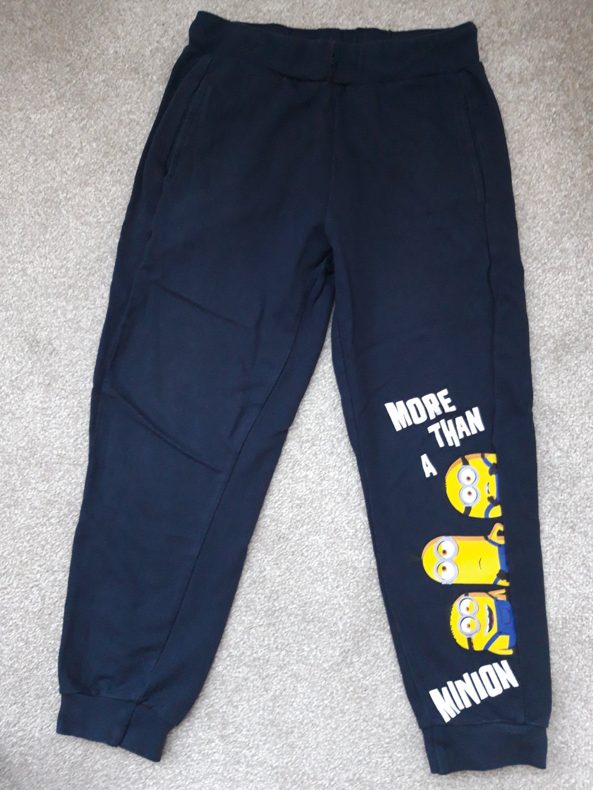 Modré tepláky po 1 synkovi, trošku žmolíčky. Velikost 122/128. Šířka v pase 26 cm, délka 72,5 cm.