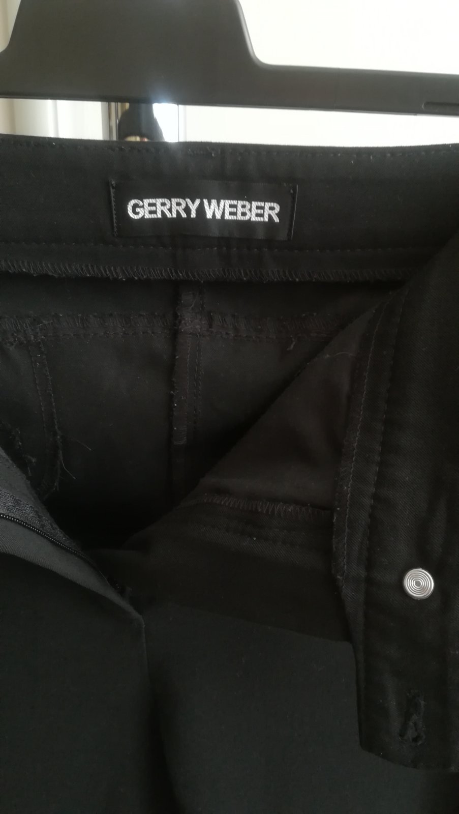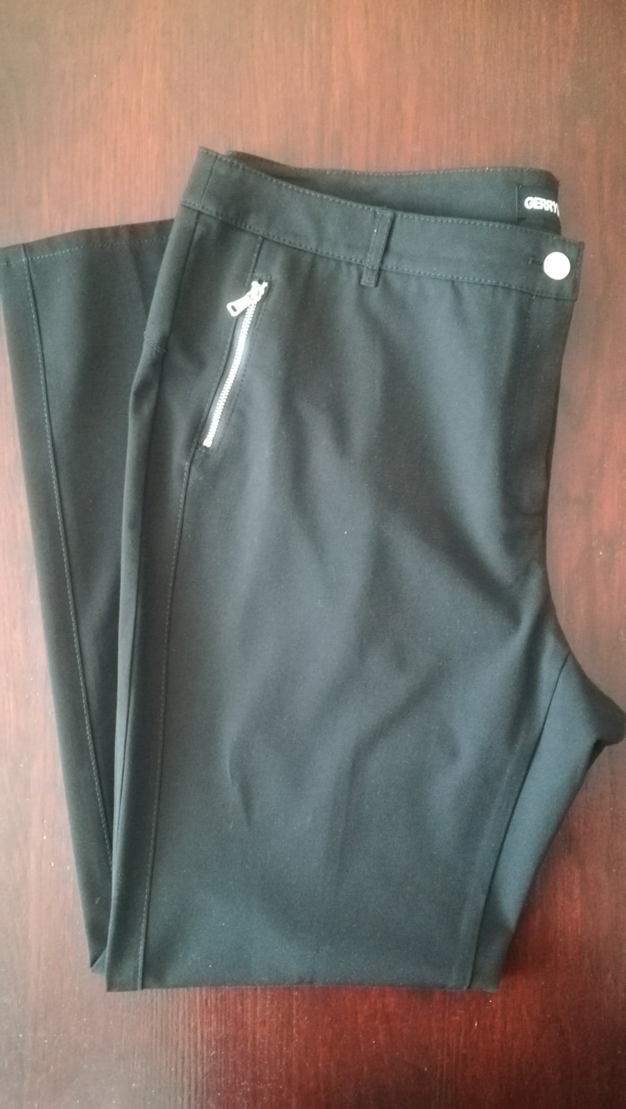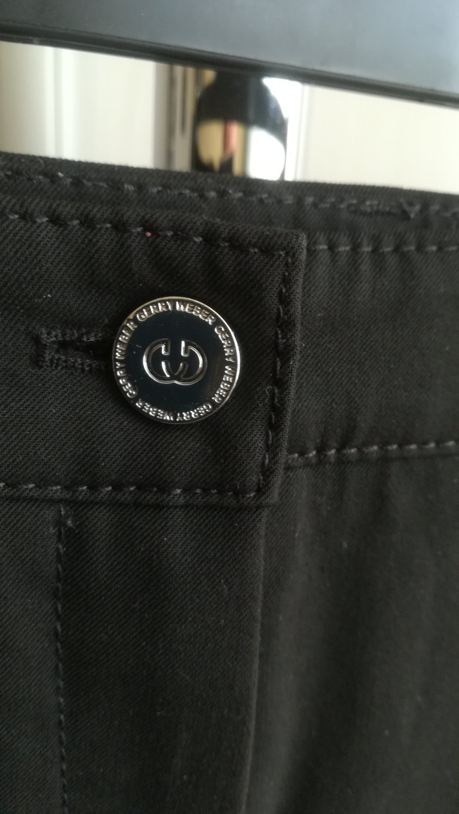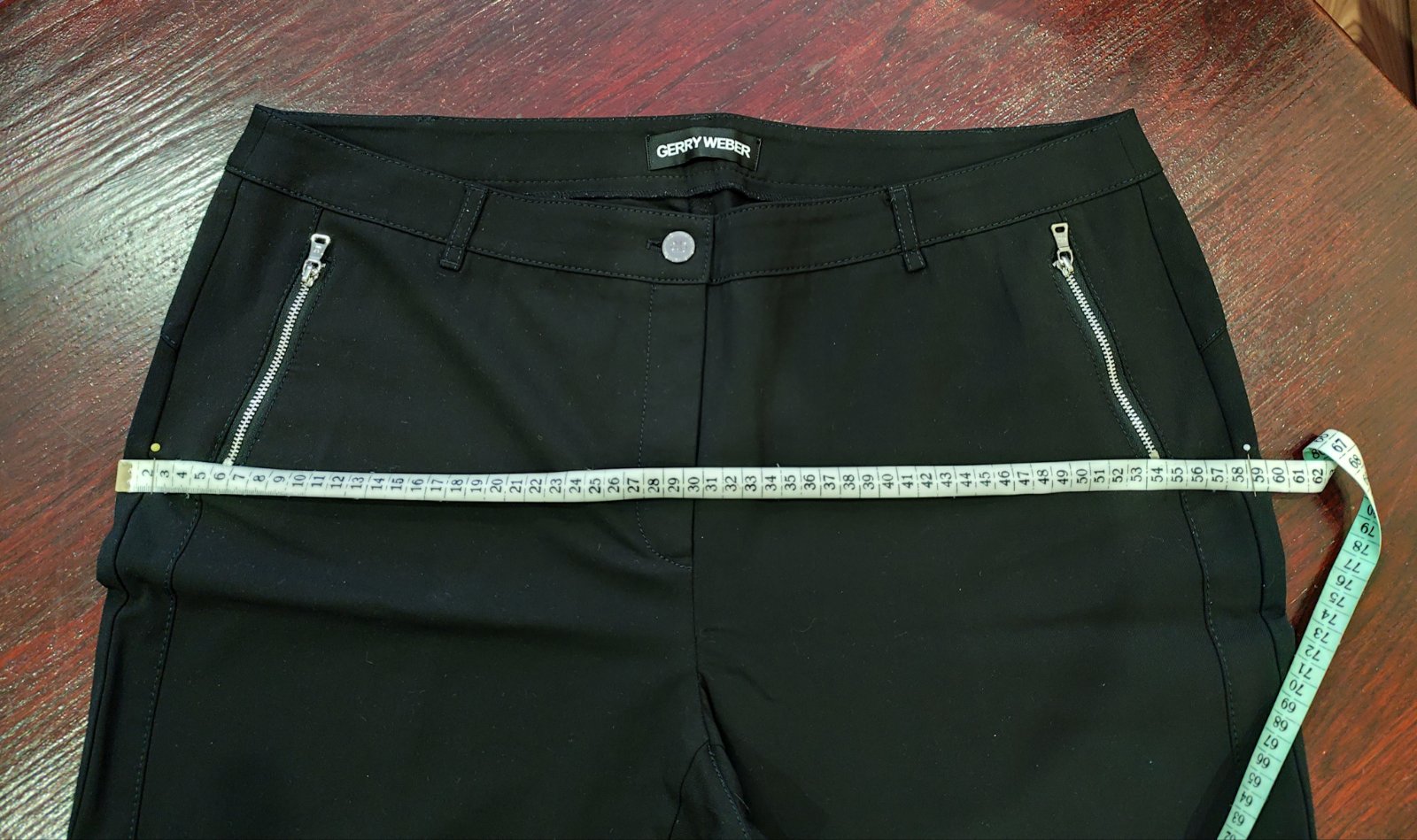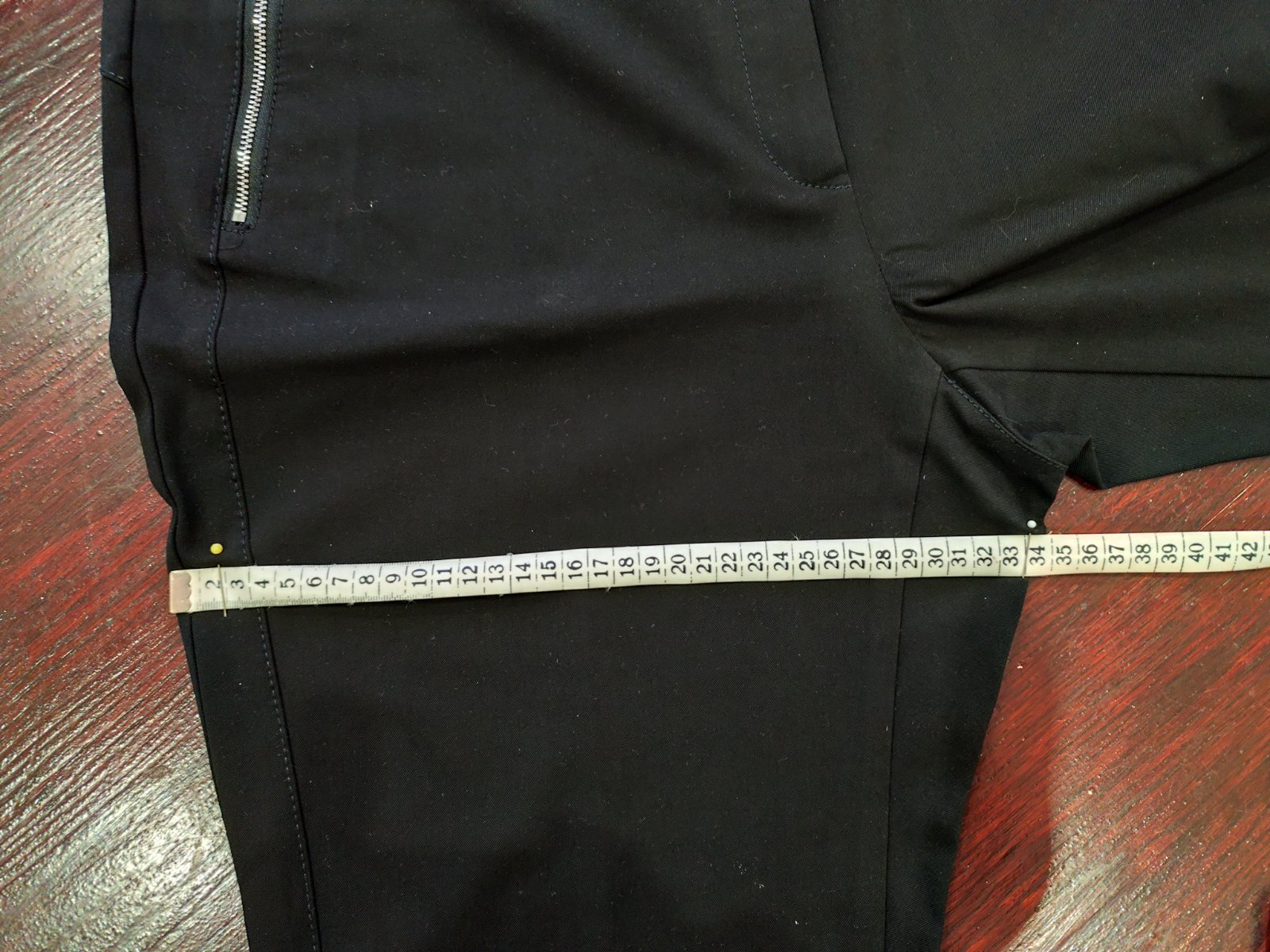 Značkové čierne nohavice úzkeho strihu, kvalitná látka, vhodné aj do práce. Vpredu 2 x funkčné vrecká na zips, vzadu ozdobné vrecká. Pevný pás s pútkami na opasok 2 x 51 cm. Šírka cez boky 2 x 59 cm, šírka cez stehno 2 x 33 cm. Dĺžka 105 cm. Odstrihnuté visačky, číslo odhadom. Párkrát oblečené, perfektný stav.