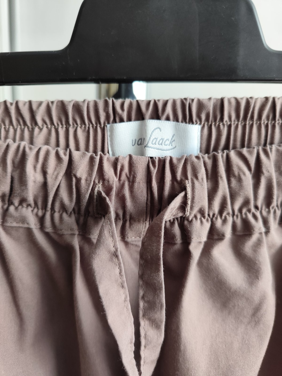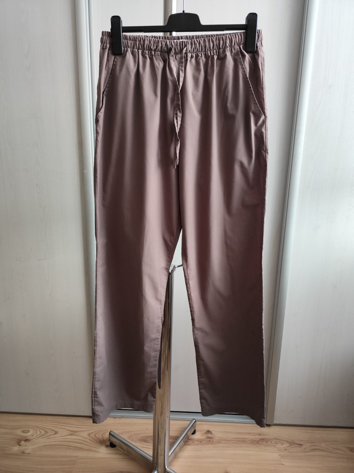 Nosené, tenké, vzdušné nohavice vo veľmi dobrom stave. V páse gumička a šnúrka, v kľude 2 x 38 cm, povolia až na 2 x 52 cm. Dĺžka 108 cm. Bez visačiek, číslo medzi L - XL. Farba ako na foto, nie celkom svetlá, ani veľmi tmavá. Vpredu 2 z vrecko.