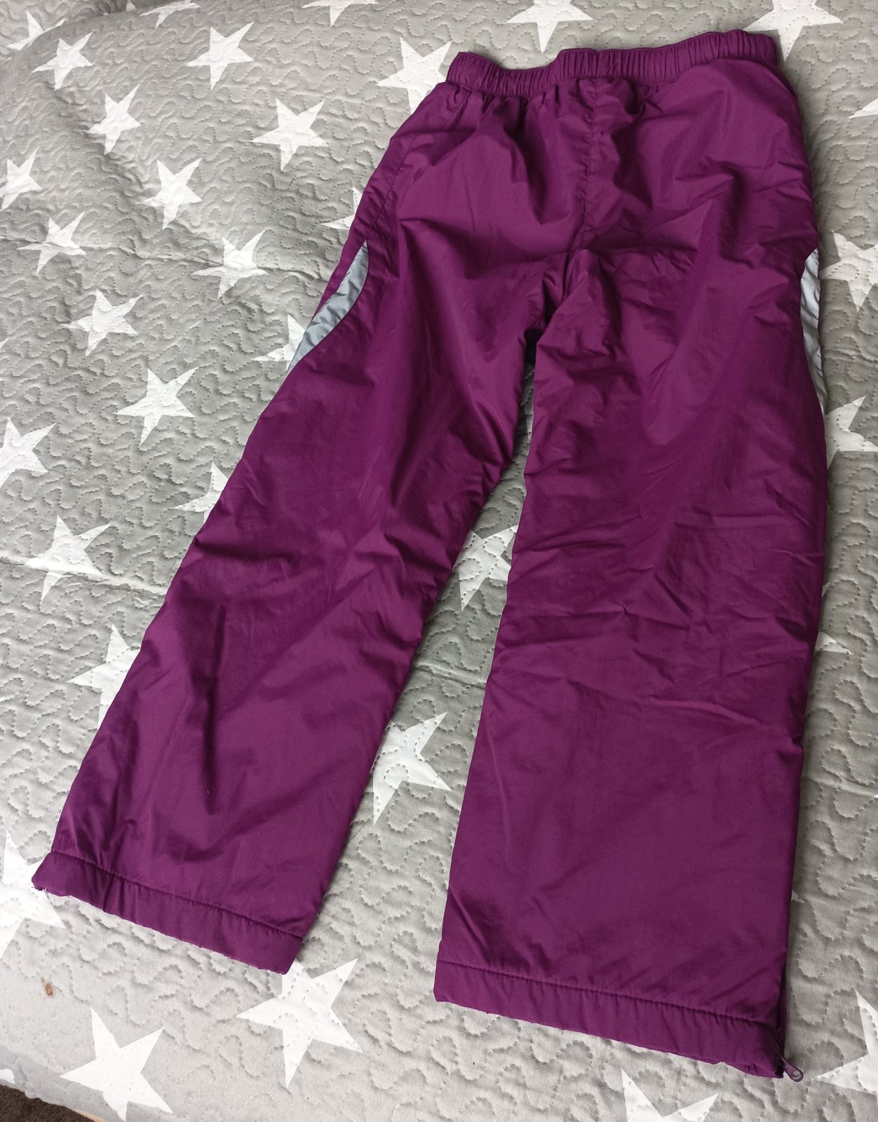fialové kalhoty vel 128,materiál plátno uvnitř vložka,vhodné na štíhlé děti kvůli spodním lemům. Mohu poměřit celkovou délku.