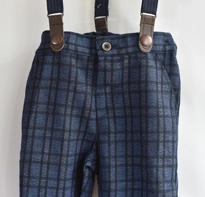 Tm. modré plátěné kalhoty. kšandy se dají sundat.