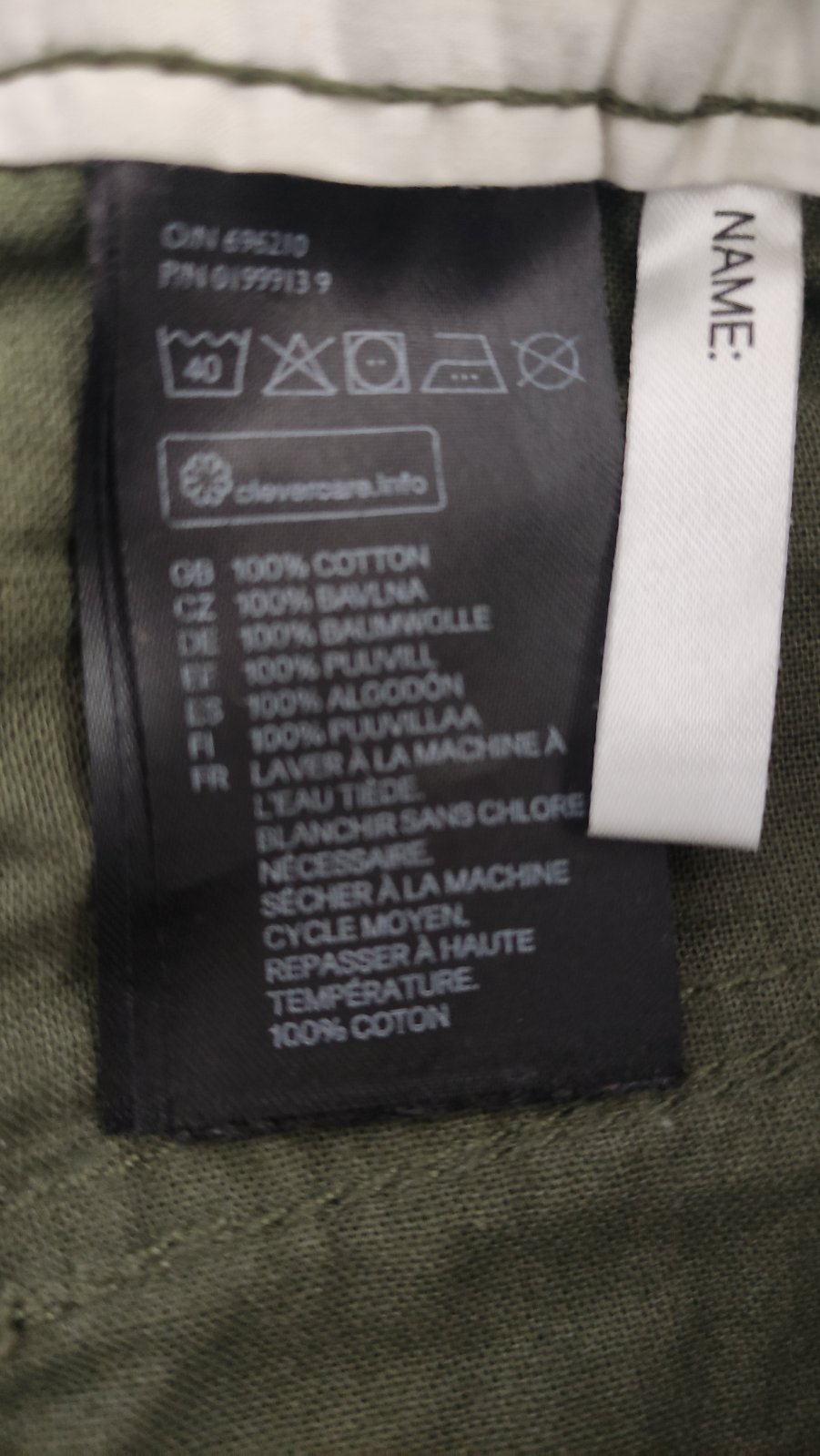 100% bavlna i stav, odstín khaki/oliva, kapsáče.