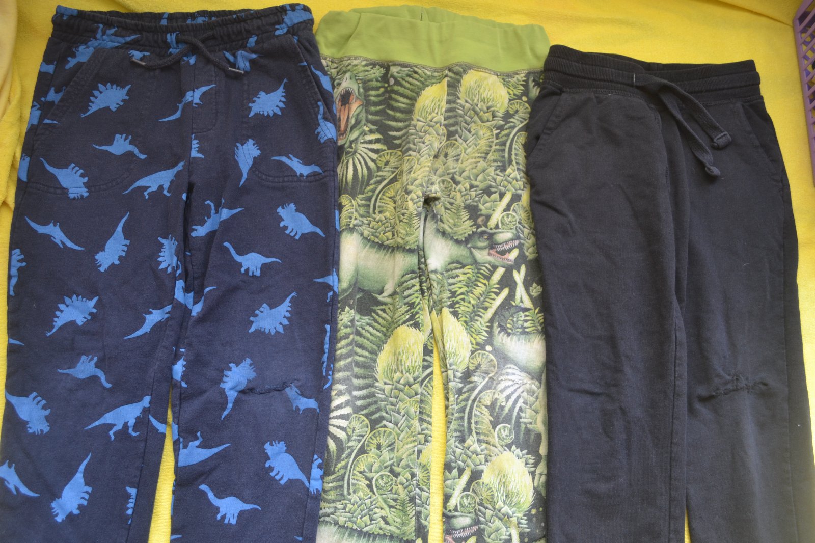 3x tepláky v.122 s ještěry, každé jsou na pravem koleni zašité, jinak uplně v pořádku, cena za vše