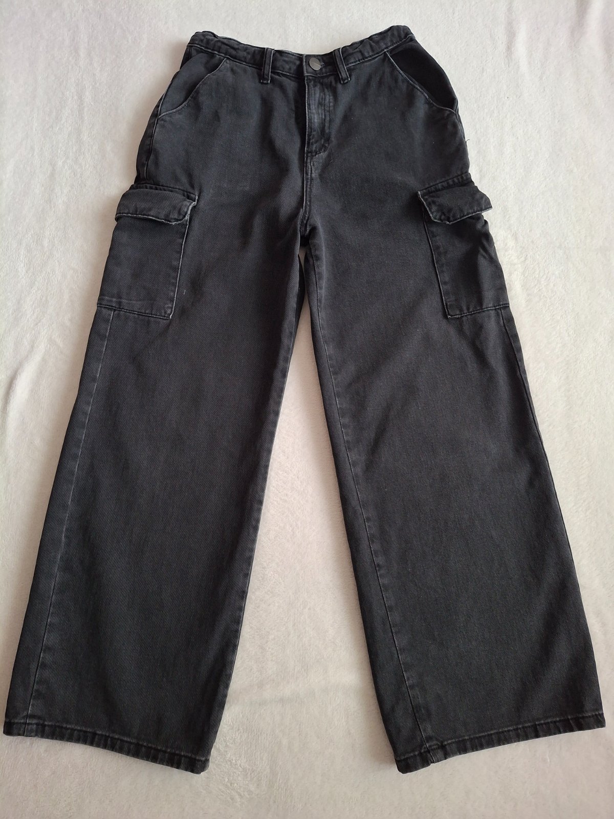 Nošené dívčí široké černé džíny s kapsami, vel. 158. Délka 90 cm, délka od rozkroku dolů 64 cm. V pase možnost regulace, šířka 2 x 31 cm.