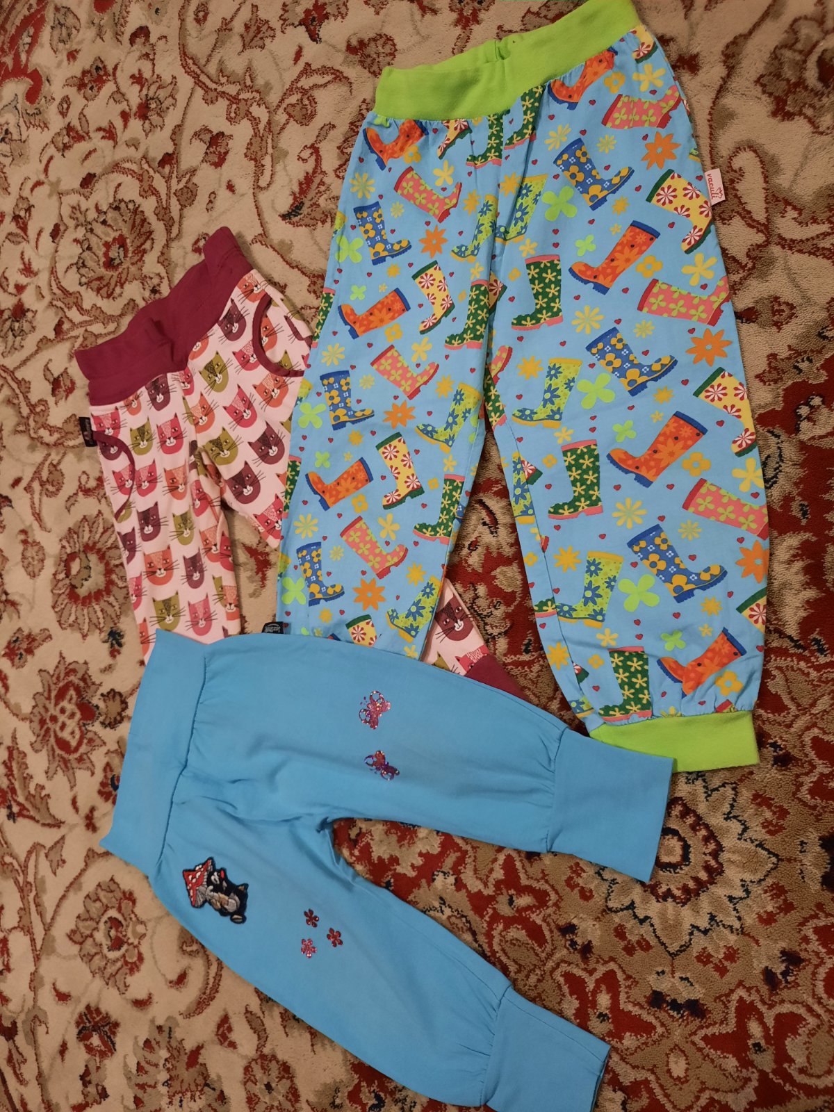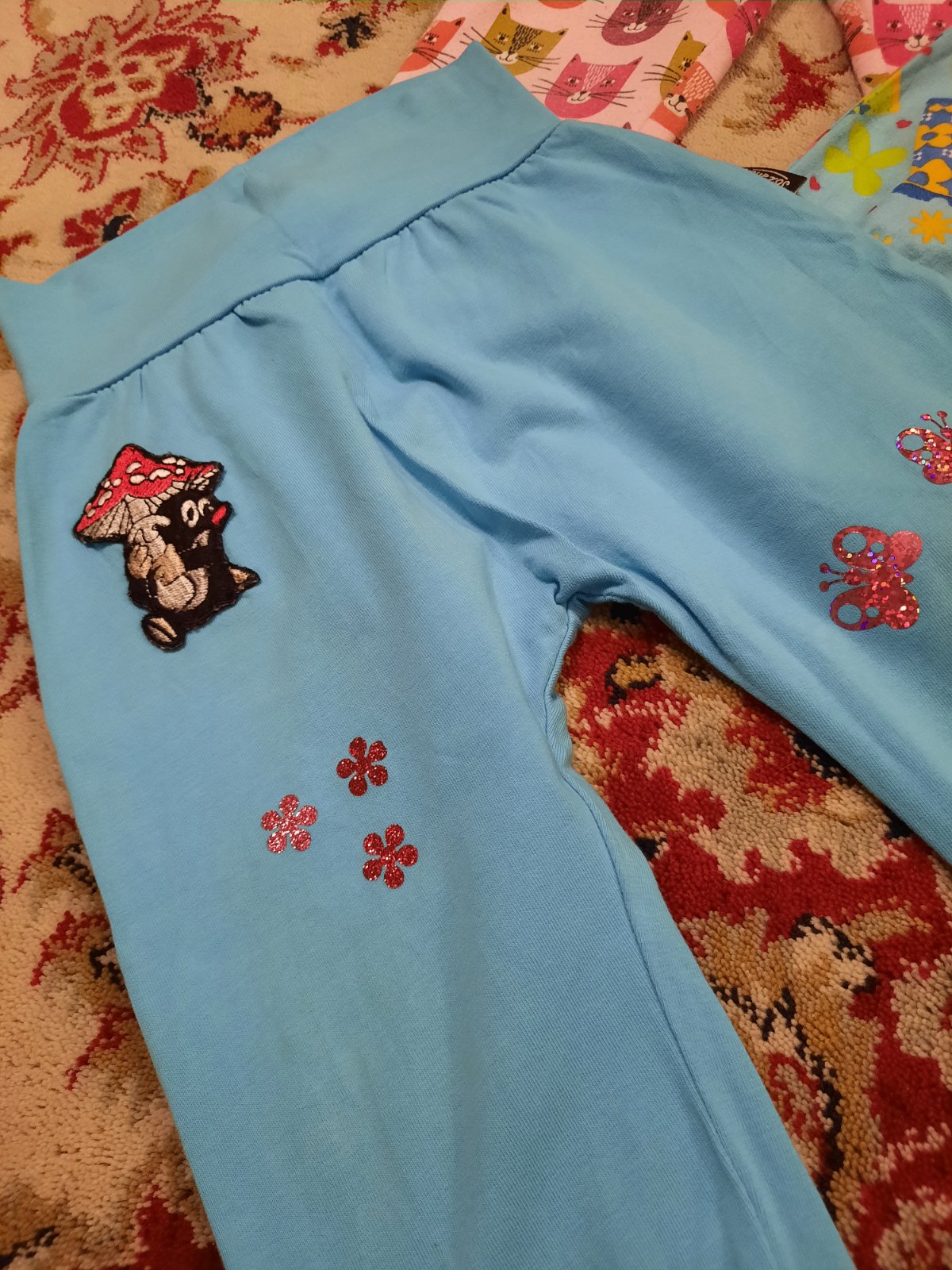 Prodám 3x tepláčky českých značek Kukadloo, Jožánek a Vaculi. Kočkové regulace v pase, žmolík, modré námi vylepšené, lze nosit dříve, botové bez vad, cena celkem.