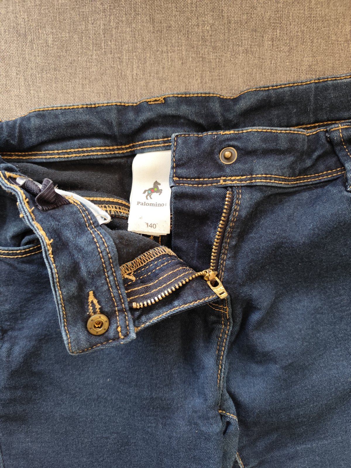 Slim rifle pro štíhlé dítko, pružná, hezky šislá riflovina, pas s regulační gumou, i když krátce nošené, našla jsem na jedné nohavice dvě malé ťupíky, nafoceno, běžně přehlednete, možná se i vypere...