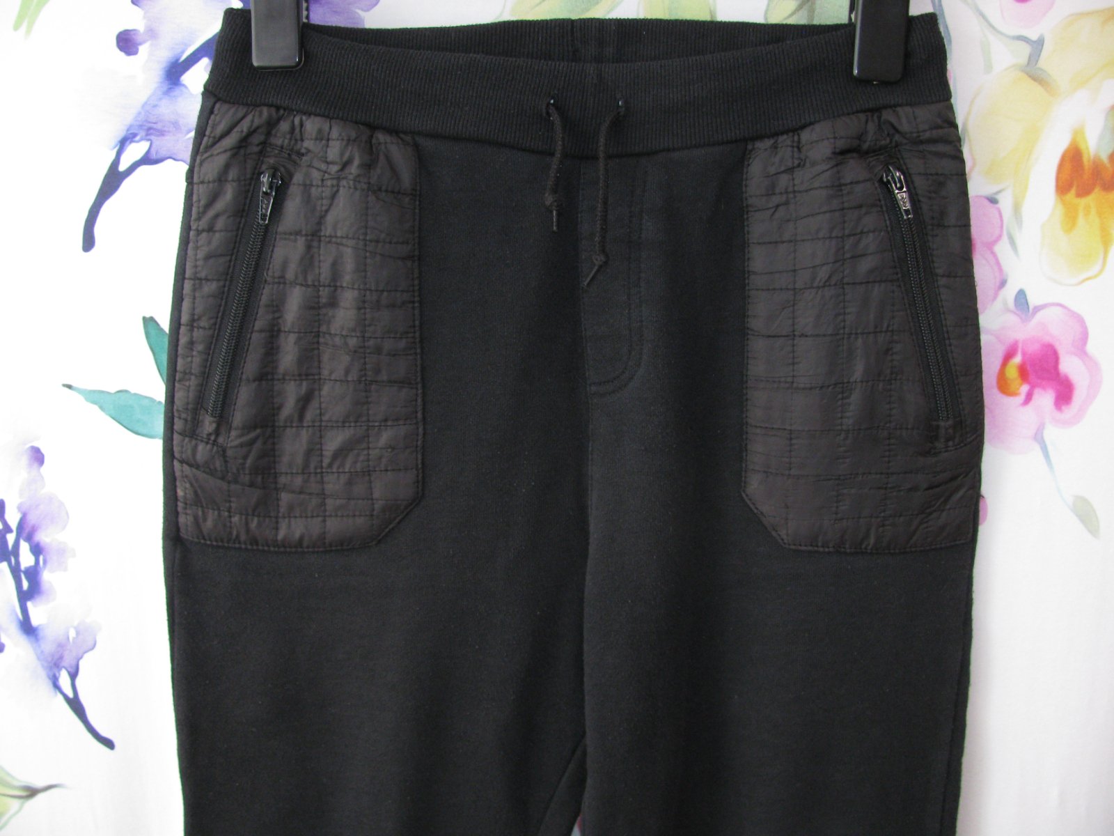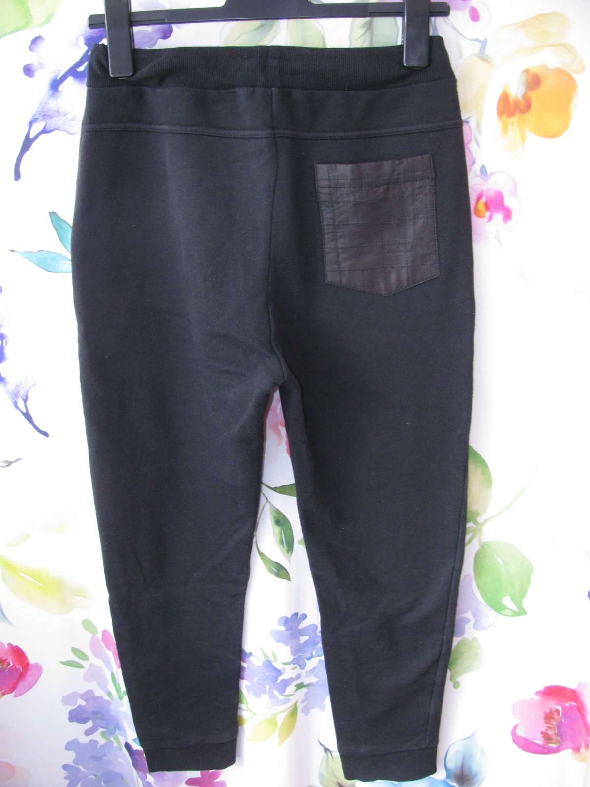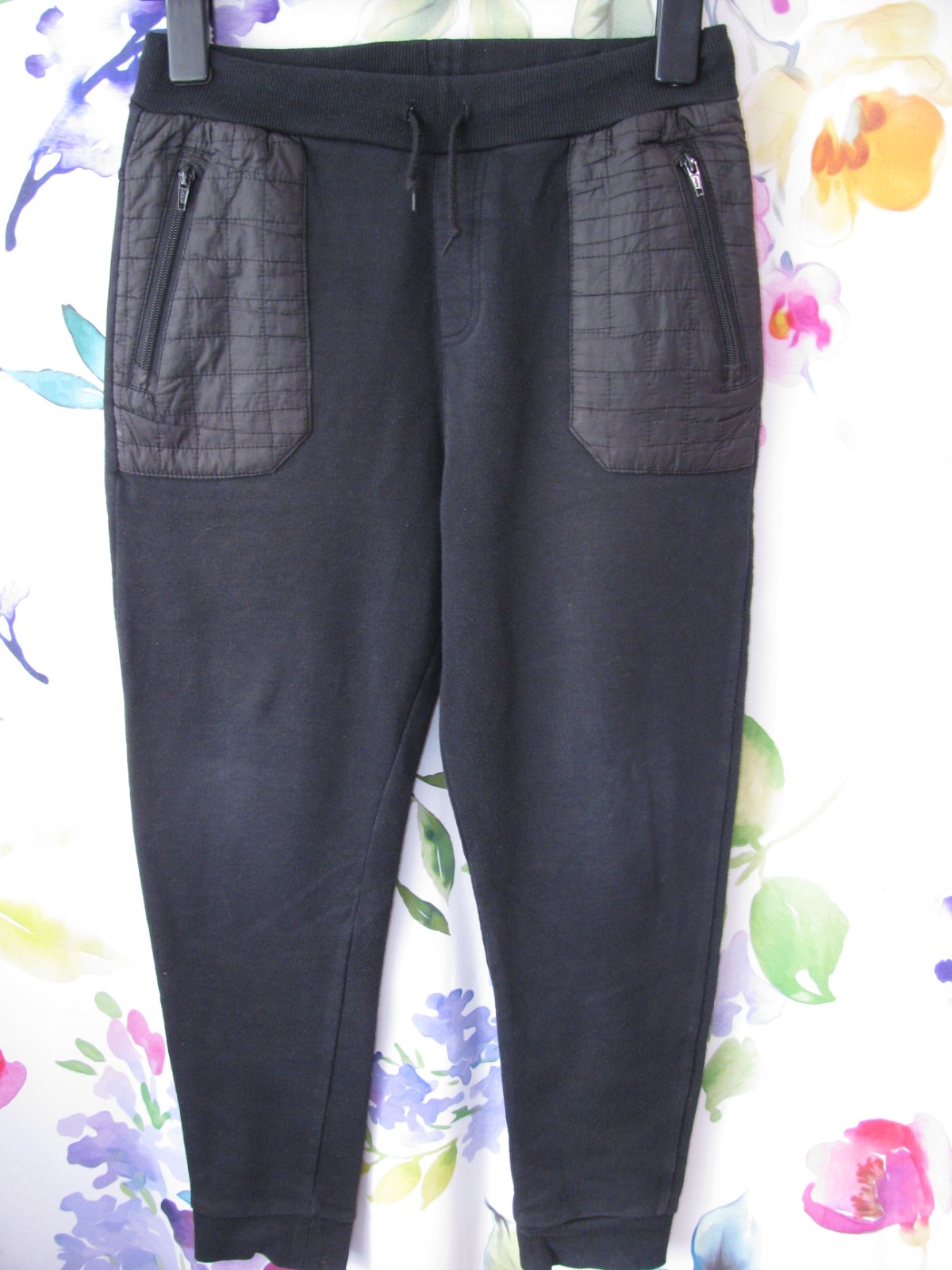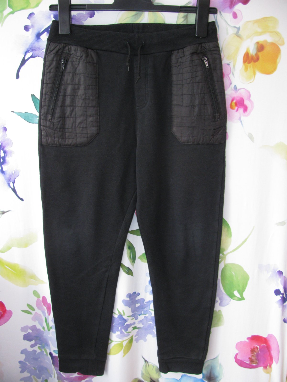 Skvělé chlapecké černé tepláky, zajímavě šité kapsy, ve předu na zip, v pase pružný náplet , guma a šňůrka, 60% bavlna, 40% polyester. Krásný stav, bez vad, jen lehce světlejší kolena a chloupek po praní.