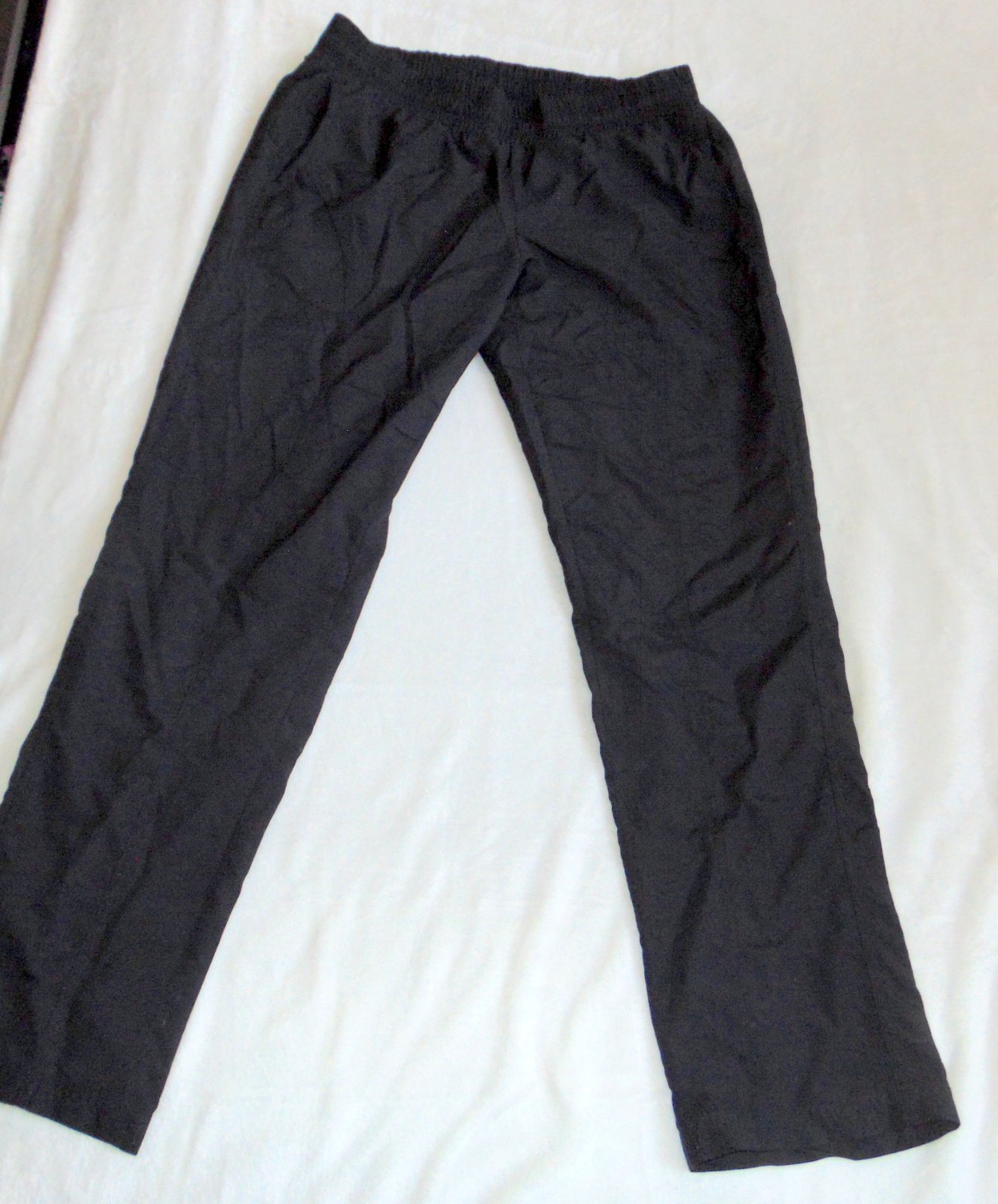 Značkové čierne nohavice úzkeho strihu, kvalitná látka, vhodné aj do práce. Vpredu 2 x funkčné vrecká na zips, vzadu ozdobné vrecká. Pevný pás s pútkami na opasok 2 x 51 cm. Šírka cez boky 2 x 59 c...