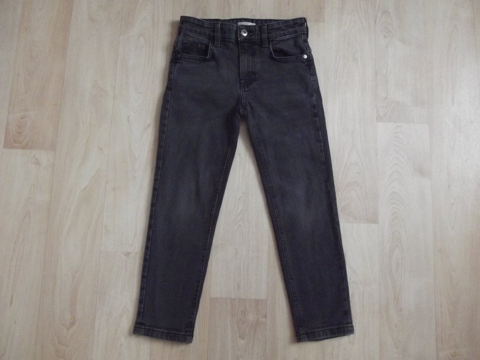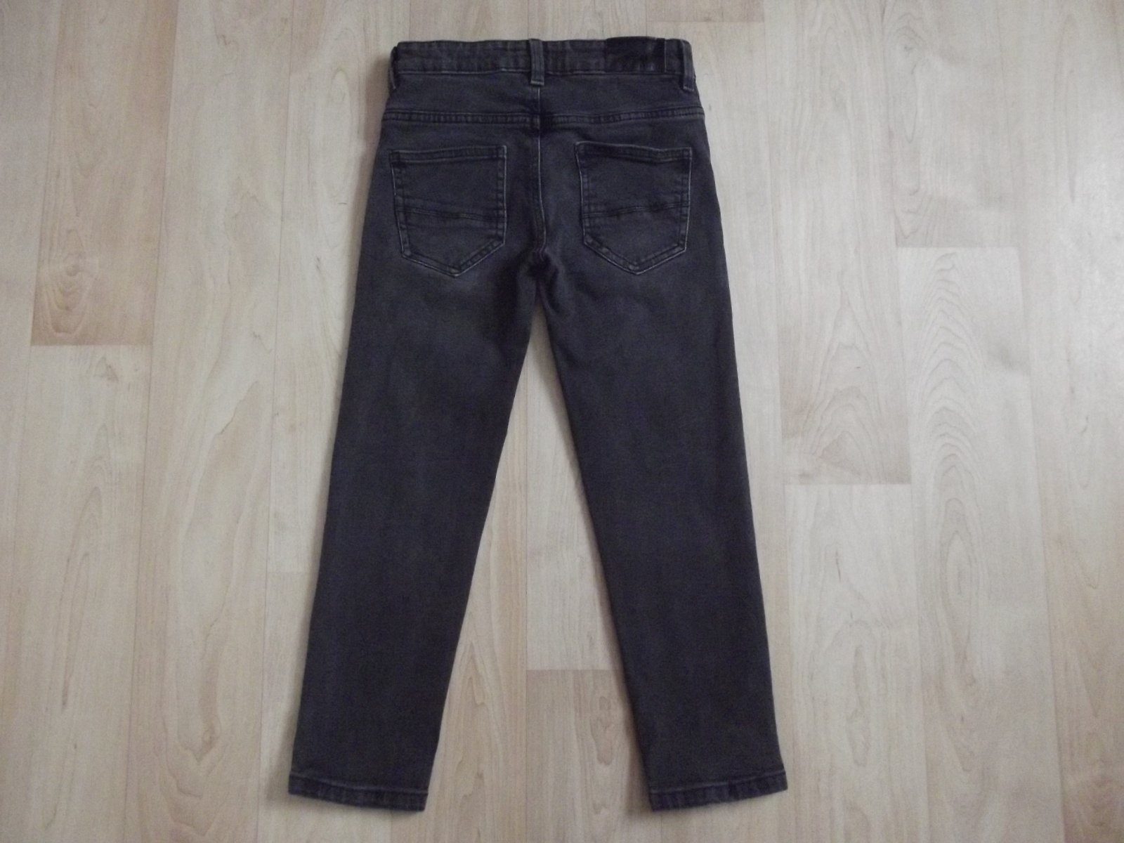 Džíny pořád pěkné, poslouží ještě hodně. Viz nit trhlá na nohavici. Velikost 134/140. Světlá černá.