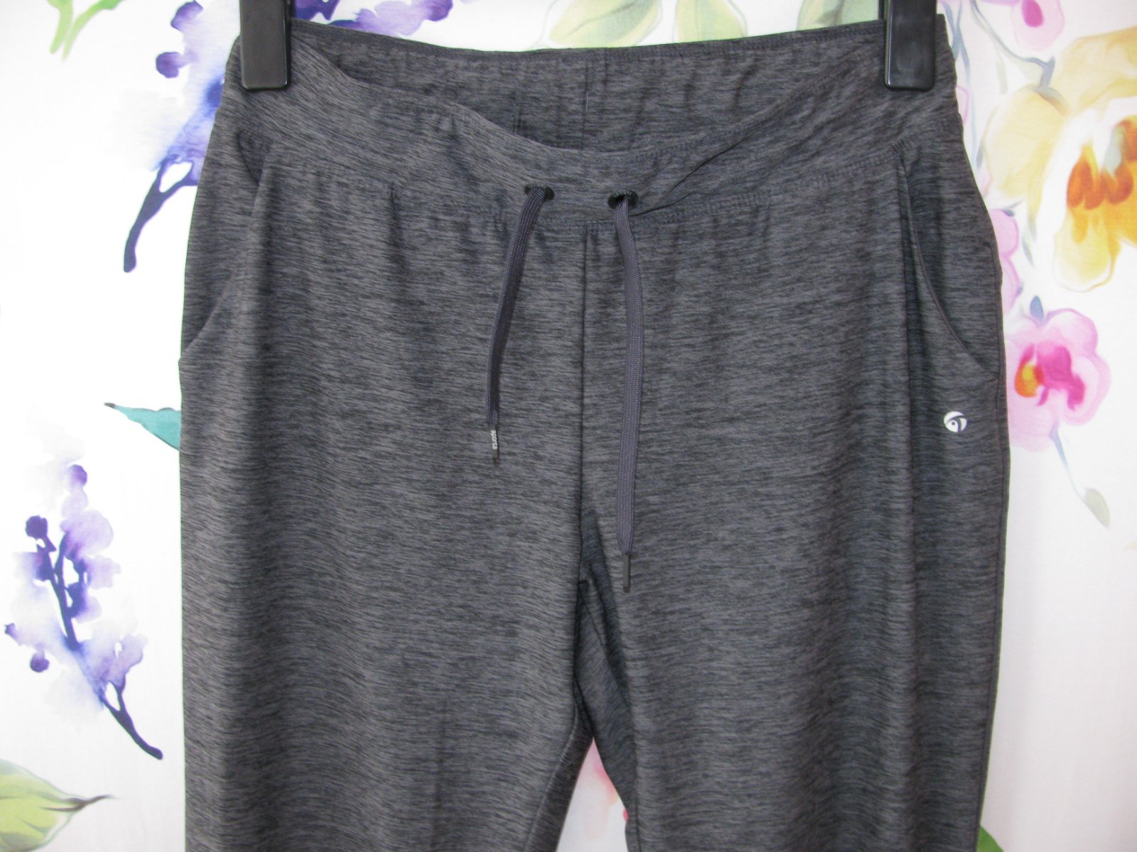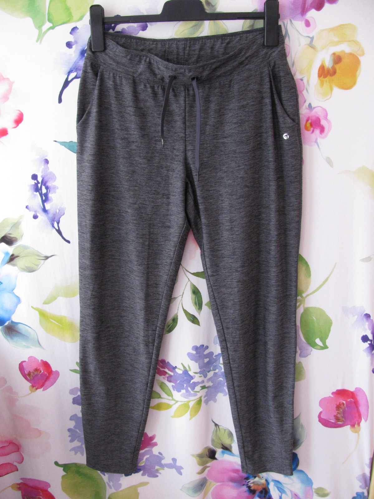 Perfektní elastické tepláky - SPORTS PERFORMANCE BY TCHIBO, boční kapsy, v pase guma a šňůrka, logo, 92% polyester, 8% elastan. Barva šedofialová s černým střikem.