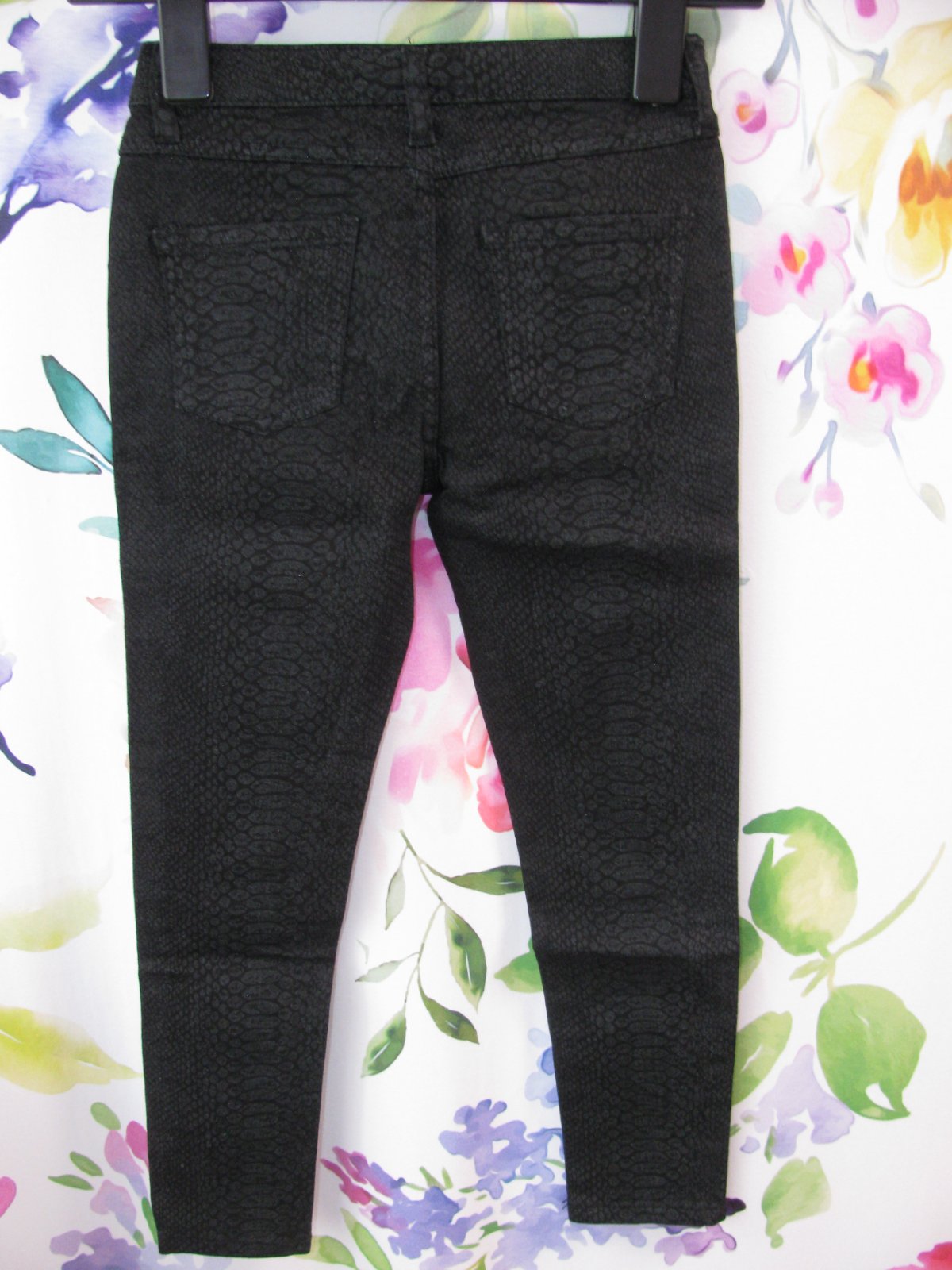 Strečové dívčí džíny s celoplošným vzorem, vypadají hezky a velice zajímavě, přední, zadní kapsy, zap. na zip a drukový knoflík, v pase regulace, 99% bavlna, 1% elastan, dále-52% polyester, 48% bavlna.