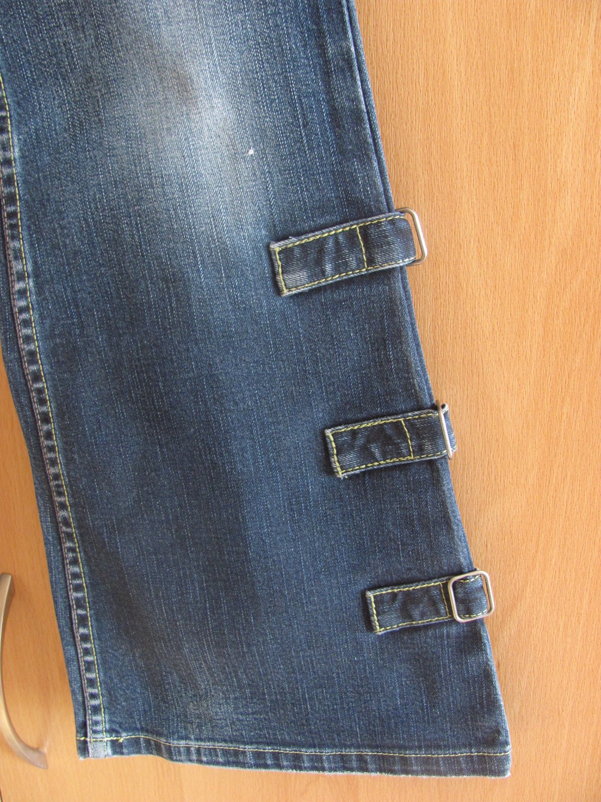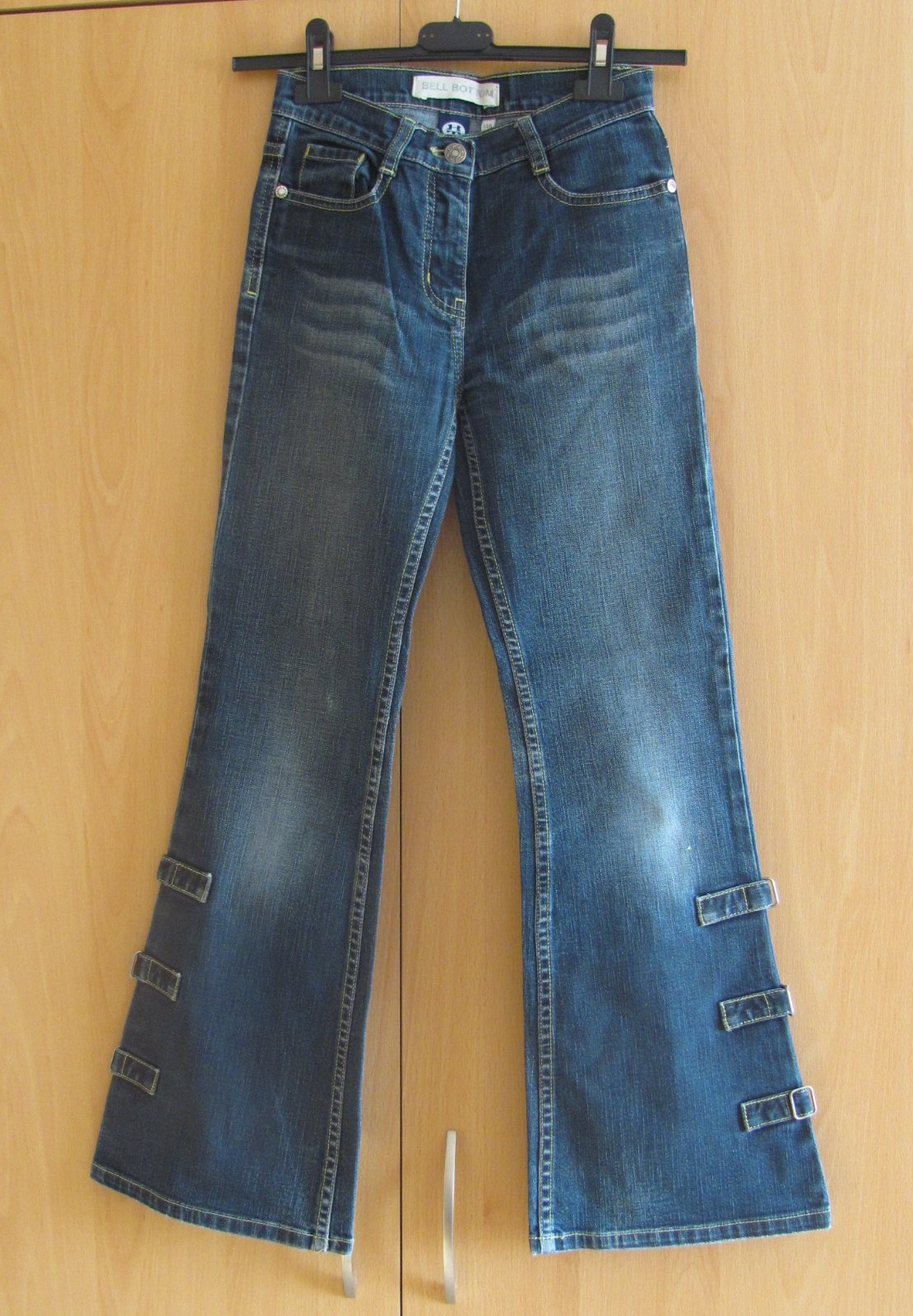 Džíny Here & There, mírně pružné, zvonové nohavice. Velikost 146, pas 30 cm, délka 89 cm.