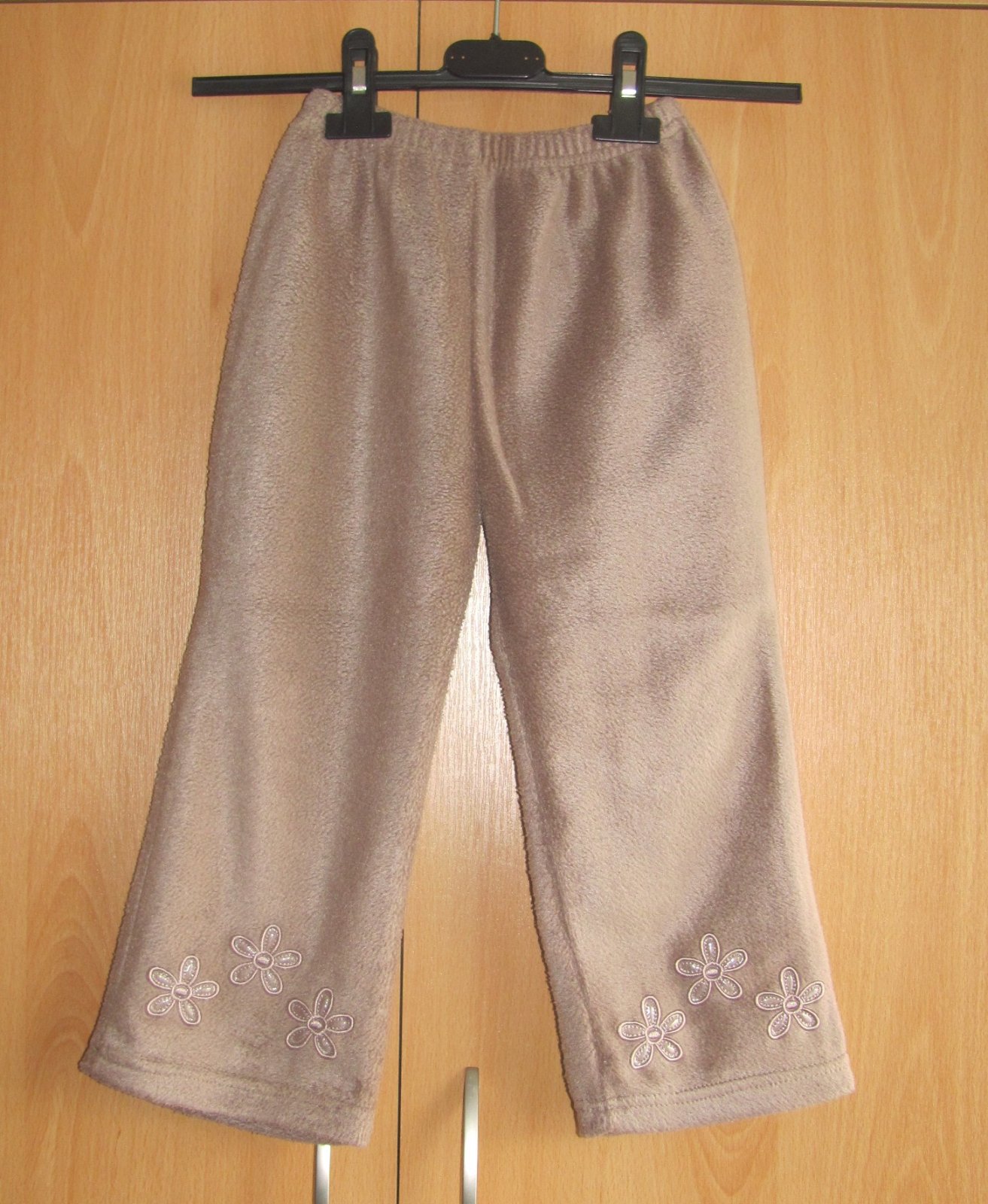 Hnědé flaušové kalhoty, v pase guma, aplikace na nohavicích. Velikost 110, pas 21 - 32 cm, délka 58 cm.
