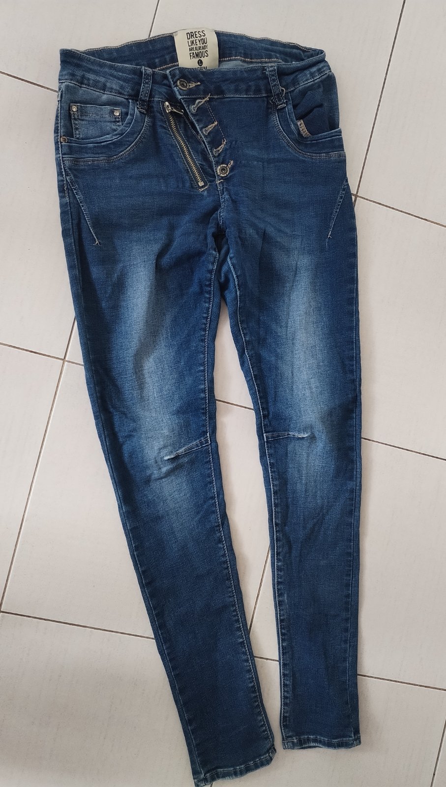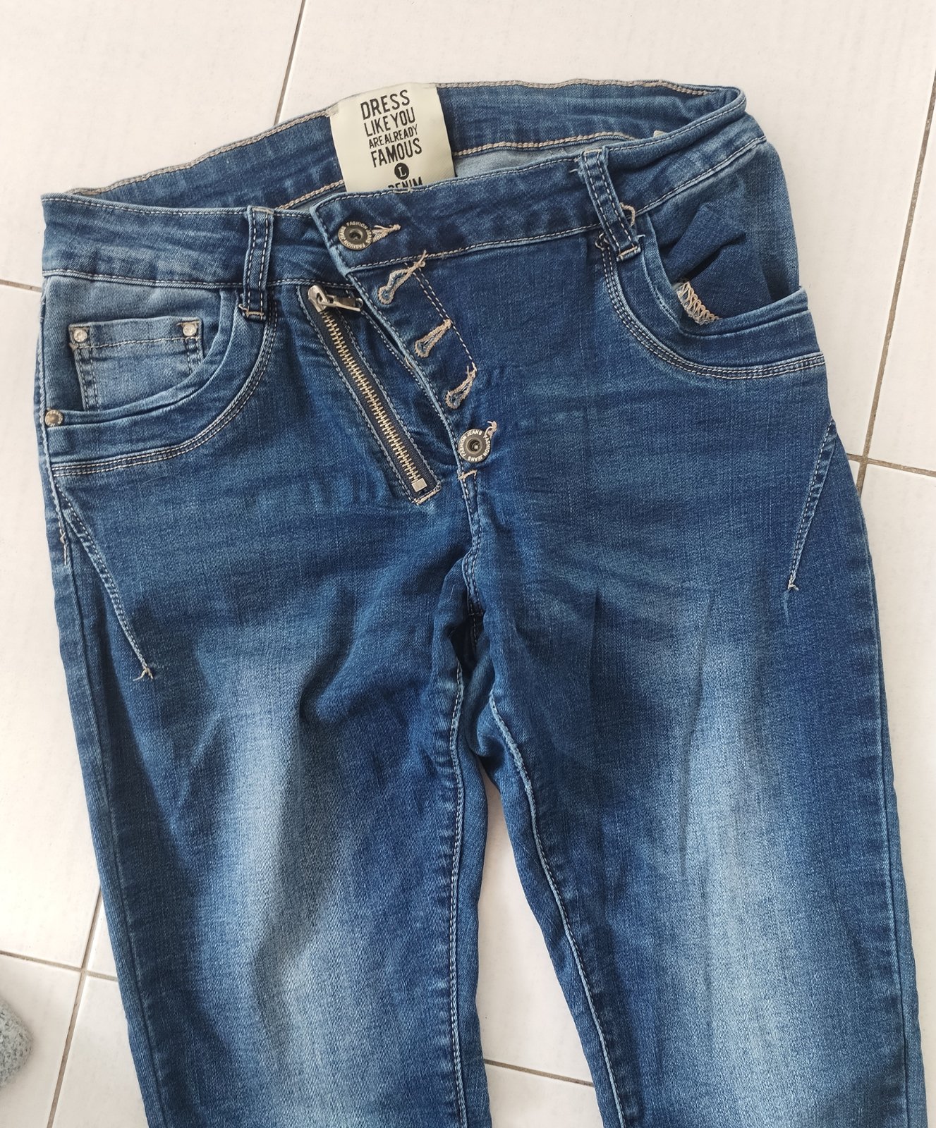 Použité ale moc pěkné, originální a TOP. Vyšší pas na v klidu 80cm a povolí na max.92cm,boky v klidu 98-max.110cm, př.sed 23cm,zadní 35cm-obojí nenatažené, stehno pod rozkrokem 2×25-max.30cm. Boční délka i s pasem 99cm,spodek nohavice má 2×16-max.22cm.. Měkčí a moc příjemná-poddajná džínovina. Psaná vel.L a myslím odpovídají - prosím měřte.!