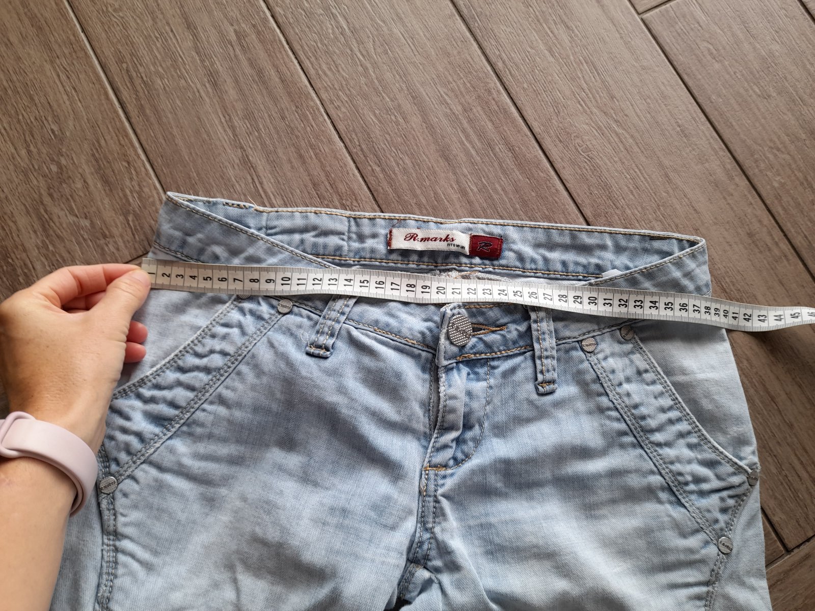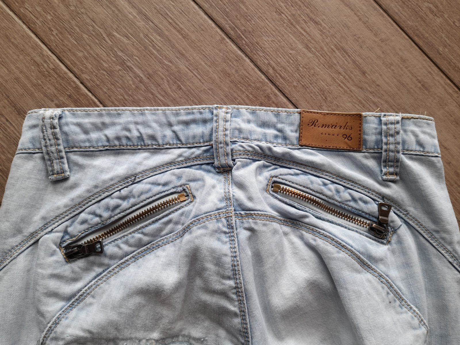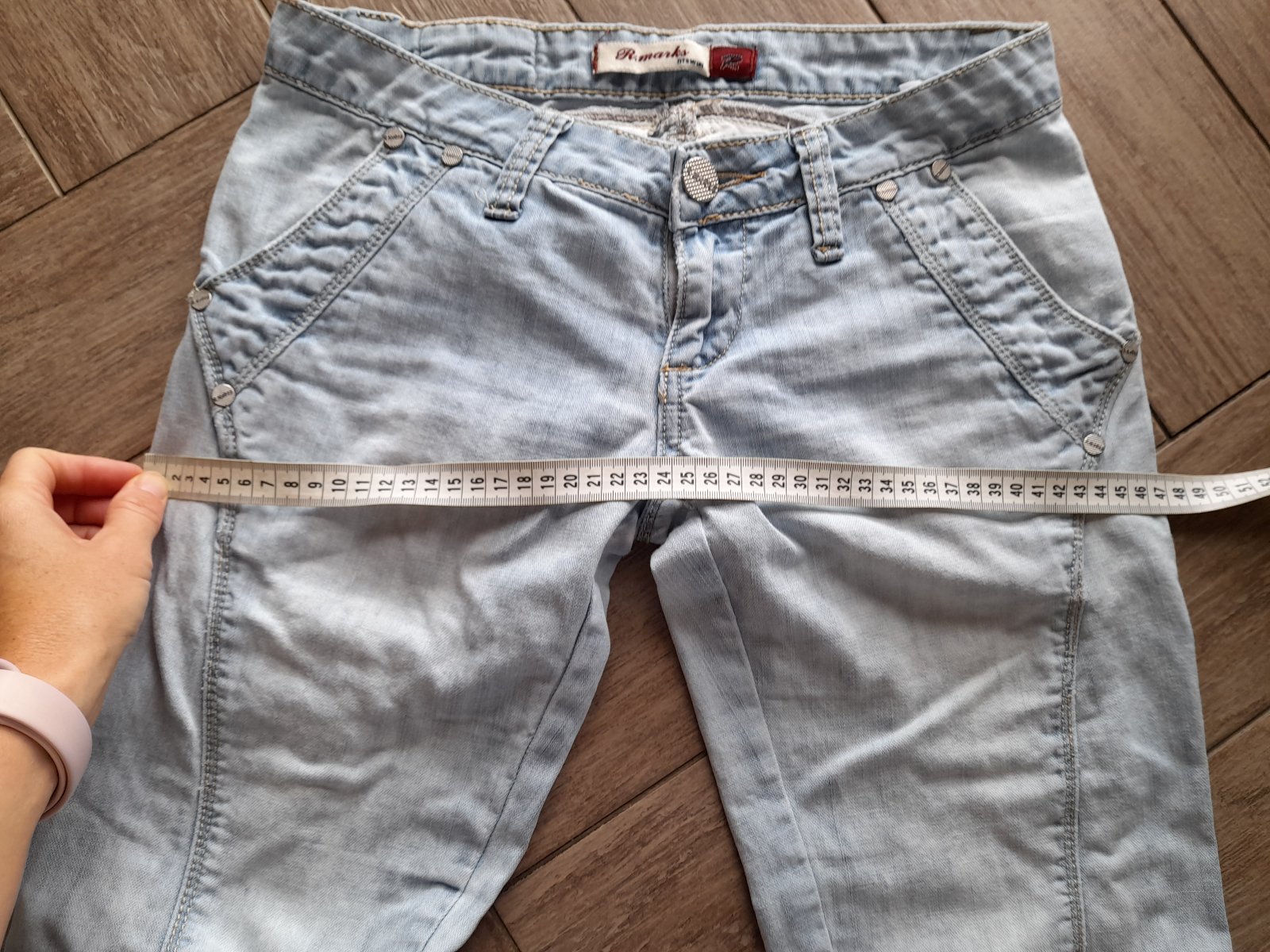 Světle modré džíny vel. odhaduji S-M, ale raději měřte - rozměry viz foto. Na zadku zašívané záplatou, zohledněno v ceně.