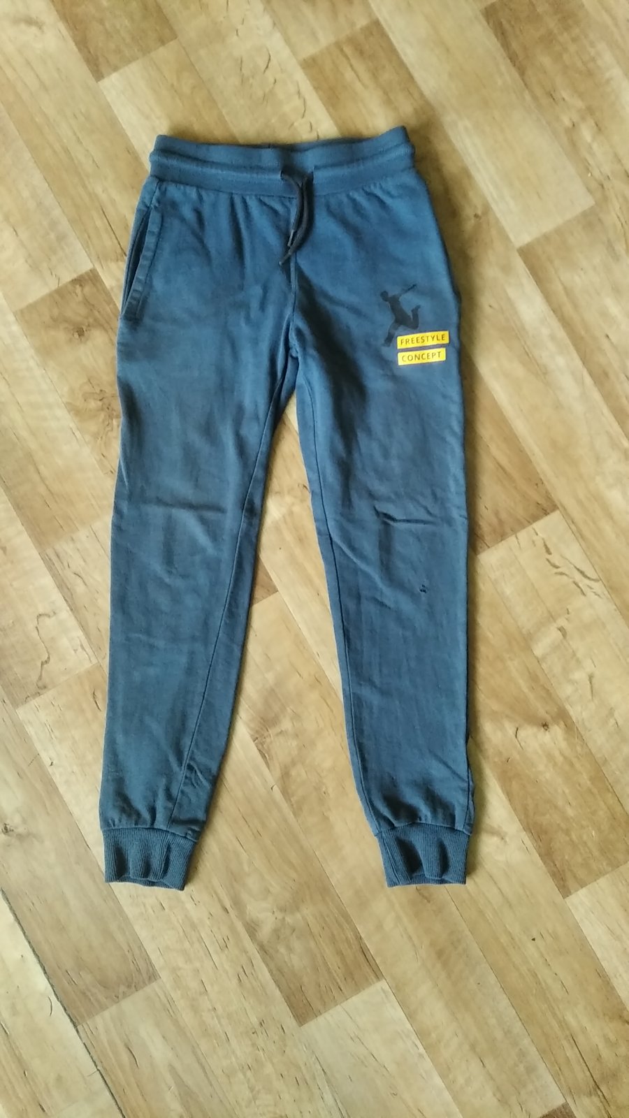 Prodám tepláky, vel.134. Celková délka je 80 cm, dvě boční kapsy, v pase guma a stažitelné šňůrky. Běžně nošený stav, pod kolenem malá dírka.